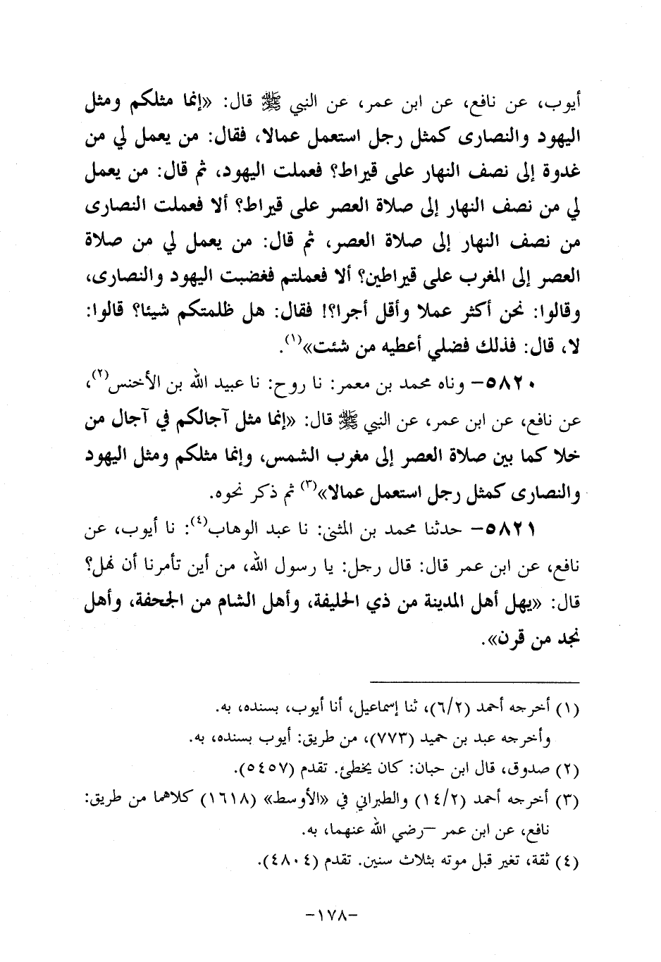 5821- حَدَّثنا مُحَمَّدُ بْنَ الْمُثَنَّى، حَدَّثنا عَبد الوَهَّاب، حَدَّثنا أَيُّوبُ، عَن نافعٍ، عَن ابْنِ عُمَر قَالَ: قَالَ رَجُلٌ: يَا رَسولَ اللهِ مِنْ أَيْنَ تَأْمُرُنَا أَنْ نُهِلَّ؟ قَالَ: يُهِلُّ أَهْلُ الْمَدِينَةِ مِنْ ذِي الْحُلَيْفَةَ وَأَهْلُ الشَّامِ مِنَ الْجُحْفَةِ وَأَهْلُ نَجْدِ مِنْ قَرْنٍ.
