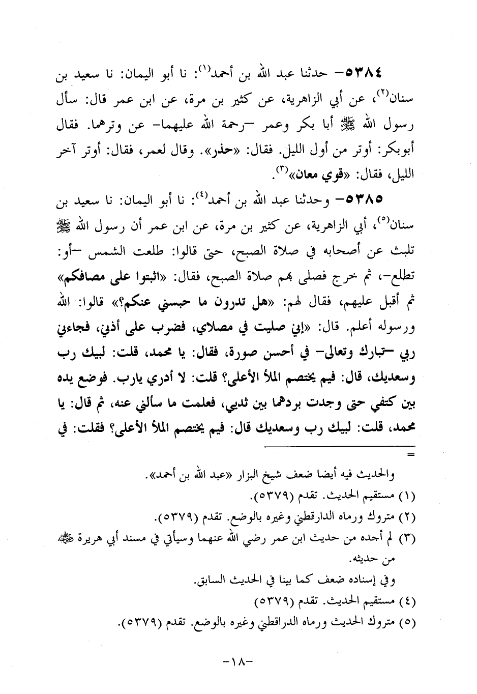 5385 - وحَدَّثنا عَبد الله بن أحمد، حَدَّثنا أَبُو اليمان، حَدَّثنا سَعِيد بْنُ سِنَانٍ أَبِي الزَّاهِرِيَّةِ، عَن كَثِيرِ بْنِ مُرَّةَ، عَن ابْنِ عُمَر؛ أَن رَسولَ اللهِ صَلَّى اللَّهُ عَلَيه وَسَلَّم تَلَبَّثَ، عَن أَصْحَابِهِ فِي صَلاةِ الصُّبْحِ حَتَّى قَالُوا: طَلَعَتِ الشَّمْسُ، أَوْ: تَطْلُعُ، ثُمَّ خَرَجَ فَصَلَّى بِهِمْ صَلاةَ الصُّبْحِ فَقَالَ: اثْبُتُوا عَلَى مَصَافِّكُمْ، ثُمَّ أَقْبَلَ عَلَيْهِمْ فَقَالَ لَهُمْ: هَلْ تَدْرُونَ مَا حَبَسَنِي عَنْكُمْ؟ قَالُوا: اللَّهُ وَرَسُولُهُ أَعْلَمُ. قَالَ: إِنِّي صَلَّيْتُ فِي مُصَلايَ فَضَرَبَ عَلَى أُذُنِي فَجَاءَنِي رَبِّي تَبَارَكَ وَتَعَالَى فِي أَحْسَنِ صُورَةٍ، فَقَالَ: يَا مُحَمَّدُ قُلْتُ: لَبَّيْكَ رَبِّ وَسَعْدَيْكَ، قَالَ: فِيمَ يَخْتَصِمُ الْمَلأُ الأَعْلَى؟ قُلْتُ: لا أَدْرِي يَا رَبِّ. فَوَضَعَ يَدَهُ بَيْنَ كَتِفَيَّ حَتَّى وَجَدْتُ بَرْدَهُمَا بَيْنَ ثَدْيَيَّ فَعَلِمْتُ مَا سَأَلَنِي عَنْهُ، ثُمَّ قَالَ: يَا مُحَمَّدُ قُلْتُ: لَبَّيْكَ رَبِّ وَسَعْدَيْكَ قَالَ: فِيمَ يَخْتَصِمُ الْمَلأُ الأَعْلَى؟ فَقُلْتُ: فِي الْكَفَّارَاتِ وَالدَّرَجَاتِ قَالَ: وَمَا الْكَفَّارَاتُ وَالدَّرَجَاتُ؟ فَقُلْتُ: الْكَفَّارَاتُ إِسْبَاغُ الْوُضُوءِ عِنْدَ الْكَرِيهَاتِ وَمَشْيٌ عَلَى الأَقْدُمِ إِلَى الْجُمُعَاتِ وَجُلُوسٌ فِي الْمَسَاجِدِ خَلْفَ الصَّلَوَاتِ. وَأَمَّا الدَّرَجَاتُ: فَإِطْعَامُ الطَّعَامِ وَطِيبُ الْكَلامِ وَالسُّجُودُ بِاللَّيْلِ وَالنَّاسُ نِيَامٌ. فَقَالَ لِي رَبِّي تَبَارَكَ وَتَعَالَى سَلْنِي يَا مُحَمَّدُ، قُلْتُ: أَسْأَلُكَ فِعْلَ الْخَيْرَاتِ وَتَرْكَ الْمُنْكَرَاتِ وَحُبَّ الْمَسَاكِينِ وَأَسْأَلُكَ أَن تَغْفِرَ لِي وَتَرْحَمَنِي، وَإِذَا أَرَدْتَ بِقَوْمٍ فِتْنَةً فَتَوَفَّنِي غَيْرَ مَفْتُونٍ اللَّهُمَّ أَسْأَلُكَ حُبَّكَ وَحُبَّ مَنْ يُحِبُّكَ وَحُبَّ عَمَلٍ يُقَرِّبُنِي إِلَى حُبِّكَ اللَّهُمَّ أَسْأَلُكَ إِيمَانًا يُبَاشِرُ قَلْبِي حَتَّى أَعْلَمَ أَنْ لَنْ يُصِيبَنِي إلاَّ مَا كَتَبْتَ لِي وَرِضًا بِمَا قَدَّرْتَ علي.