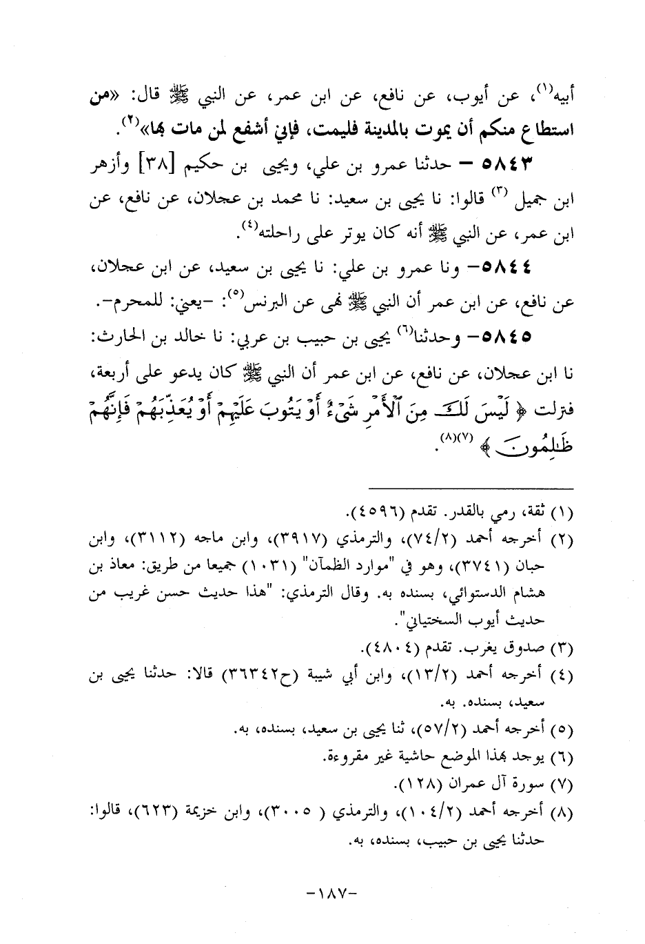 5845- وحَدَّثنا يَحْيَى بن حبيب بن عربي، حَدَّثنا خالد بن الحارث، حَدَّثنا ابْنِ عَجْلان، عَن نافعٍ، عَن ابْنِ عُمَر؛ أَن النَّبِيّ صَلَّى اللَّهُ عَلَيه وَسَلَّم كَانَ يَدْعُو عَلَى أَرْبَعَةٍ فَنَزَلَتْ: {لَيْسَ لَكَ مِنَ الأَمْرِ شَيْءٌ أَوْ يَتُوبَ عَلَيْهِمْ أَوْ يُعَذِّبَهُمْ فَإِنَّهُمْ ظَالِمُونَ} .