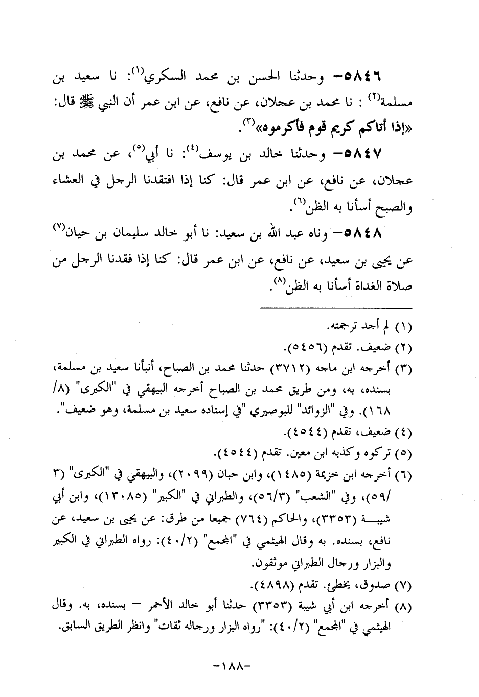 5846 - وحَدَّثنا الحسن بن مُحَمد السكري، حَدَّثنا سَعِيد بن مسلمة، حَدَّثنا مُحَمد بْنُ عَجْلان، عَن نافعٍ، عَن ابْنِ عُمَر؛ أَن النَّبِيّ صَلَّى اللَّهُ عَلَيه وَسَلَّم قَالَ: إِذَا أَتَاكُمْ كَرِيمُ قَوْمٍ فَأَكْرِمُوهُ.