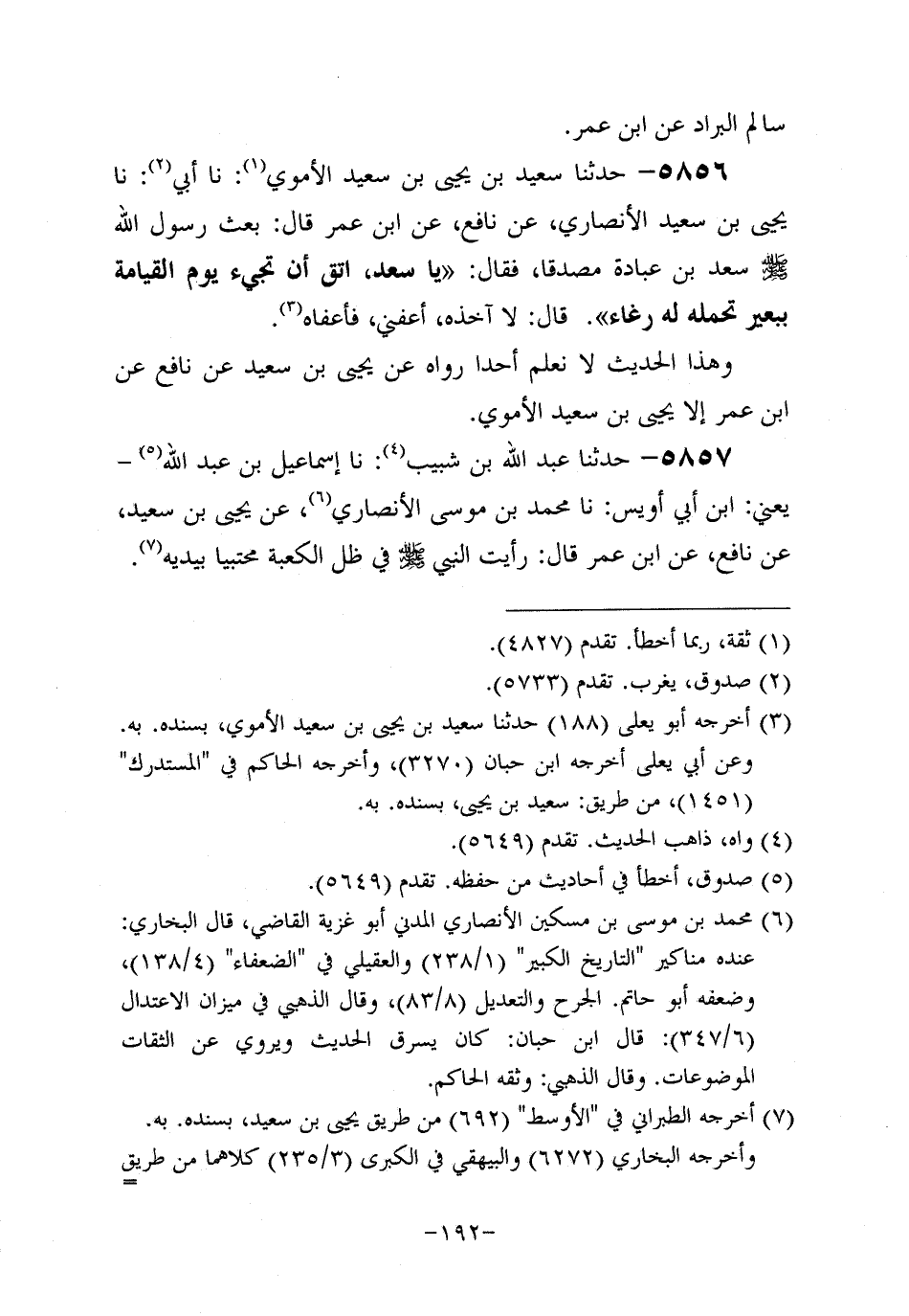 5856- حَدَّثنا سَعِيد بْنُ يَحْيَى بْنِ سَعِيد الأُمَوي، حَدَّثنا أبي، حَدَّثنا يَحْيَى بْنُ سَعِيد الأَنْصَارِيُّ، عَن نافعٍ، عَن ابْنِ عُمَر قَالَ: بَعَثَ رَسُولُ اللَّهِ صَلَّى اللَّهُ عَلَيه وَسَلَّم سَعْد بْنَ عُبَادَةَ مُصَّدَّقًا فقال: ياسعد اتِّقِ أَنْ تَجِيءَ يَوْمَ الْقِيَامَةِ بِبَعِيرٍ تَحْمِلُهُ له رغاء. قال: لاآخذه أَعْفِنِي فَأَعْفَاهُ.