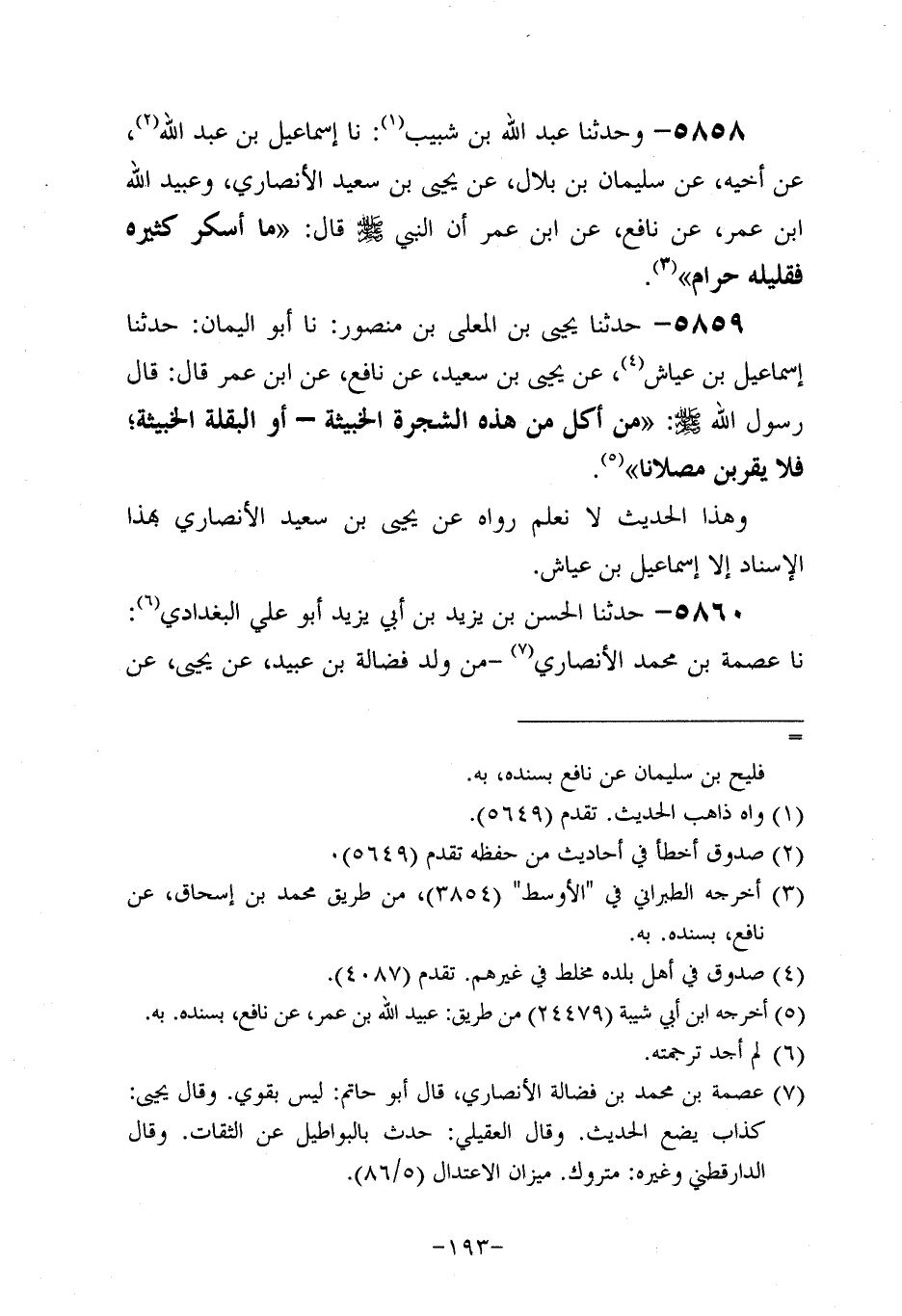 5859- حَدَّثنا يَحْيَى بن المعلى بن منصور، حَدَّثنا أَبُو الْيَمَانِ: حَدَّثنا إِسْمَاعِيلُ بْنُ عَيَّاشٍ، عَن يَحْيَى بْنُ سَعِيد، عَن نافعٍ، عَن ابْنِ عُمَر قَالَ: قَالَ رَسُول اللهِ صَلَّى اللَّهُ عَلَيه وَسَلَّم: مَنْ أَكَلَ مِنْ هَذِهِ الشَّجَرَةِ الْخَبِيثَةِ، أَوِ الْبَقْلَةِ الْخَبِيثَةِ فَلا يَقْرَبَنَّ مُصَلانَا.