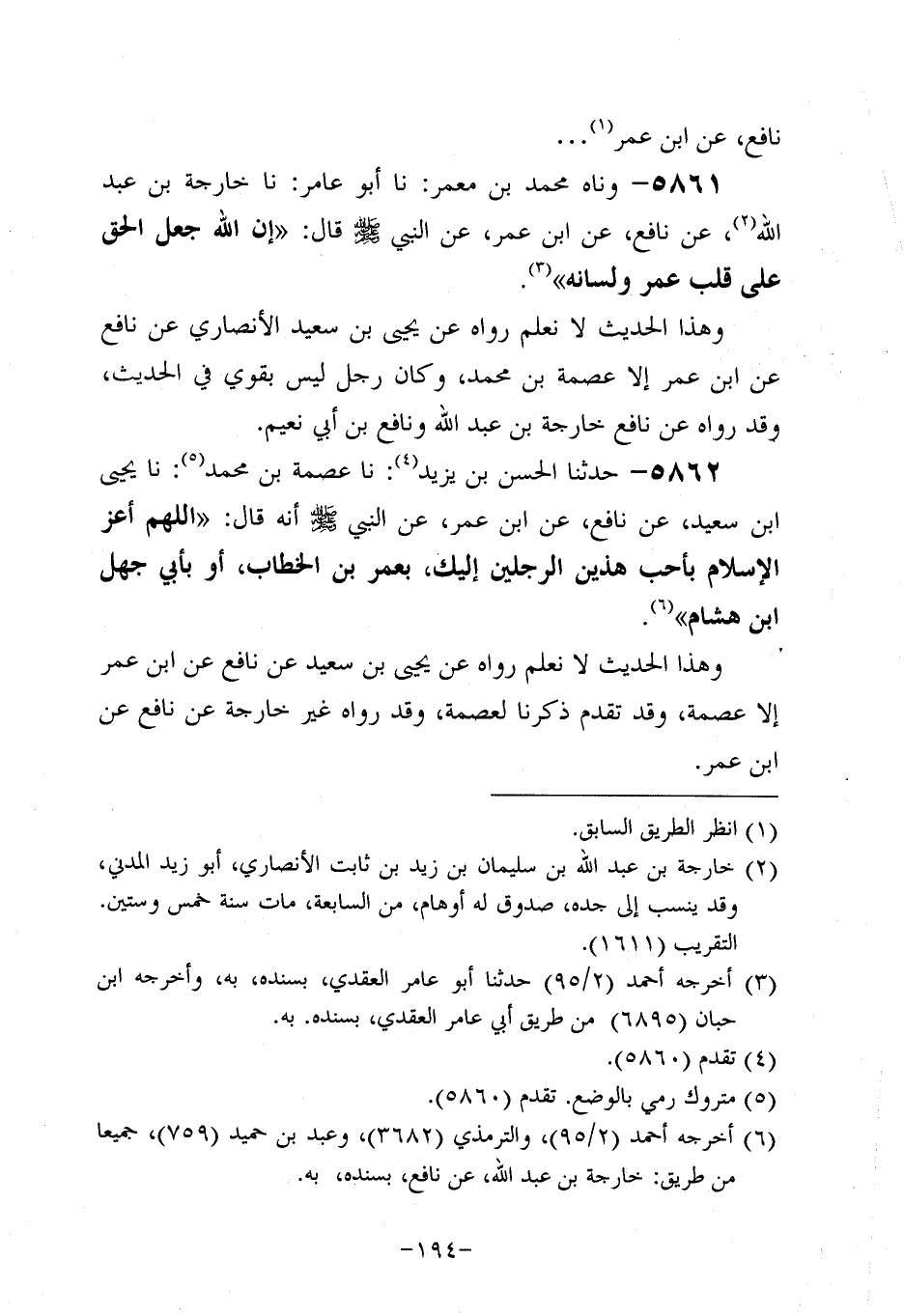 5862- حَدَّثنا الحسن بن يزيد، حَدَّثنا عصمة بن مُحَمد، حَدَّثنا يَحْيَى بْنُ سَعِيد، عَن نافعٍ، عَن ابْنِ عُمَر، عَن النَّبِيّ صَلَّى اللَّهُ عَلَيه وَسَلَّم؛ أَنَّه قَالَ: اللَّهُمَّ أَعِزَّ الإِسْلامَ بِأَحَبِّ هَذَيْنِ الرَّجُلَيْنِ إِلَيْكَ، بعُمَر بْنِ الْخَطَّابِ، أَوْ بِأَبِي جَهْلِ بْنِ هِشَامٍ.
