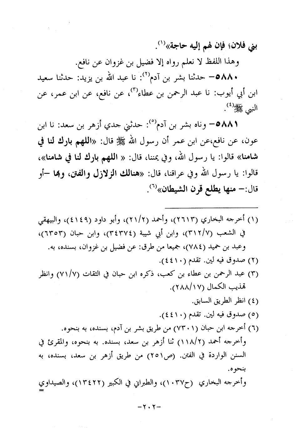 5881- وحَدَّثناه بِشْر بْنُ آدَمَ: حَدَّثَنِي جَدِّي أَزْهَرُ بْنُ سَعْد، حَدَّثنا ابْنِ عَوْنٍ، عَن نافعٍ، عَن ابْنِ عُمَر؛ أَن رَسولَ اللهِ صَلَّى اللَّهُ عَلَيه وَسَلَّم قَالَ: اللَّهُمَّ بَارِكْ لَنَا فِي شَامِنَا قَالُوا: يَا رَسولَ اللهِ وَفِي يَمَنِنَا قَالَ: اللَّهُمَّ بَارِكْ لَنَا فِي شَامِنَا قَالُوا: يَا رَسولَ اللهِ وَفِي عِرَاقِنَا قَالَ: هُنَالِكَ الزَّلازِلُ وَالْفِتَنُ وَبِهَا، أَوْ قَالَ: مِنْهَا يَطْلُعُ قَرْنُ الشَّيْطَانِ.