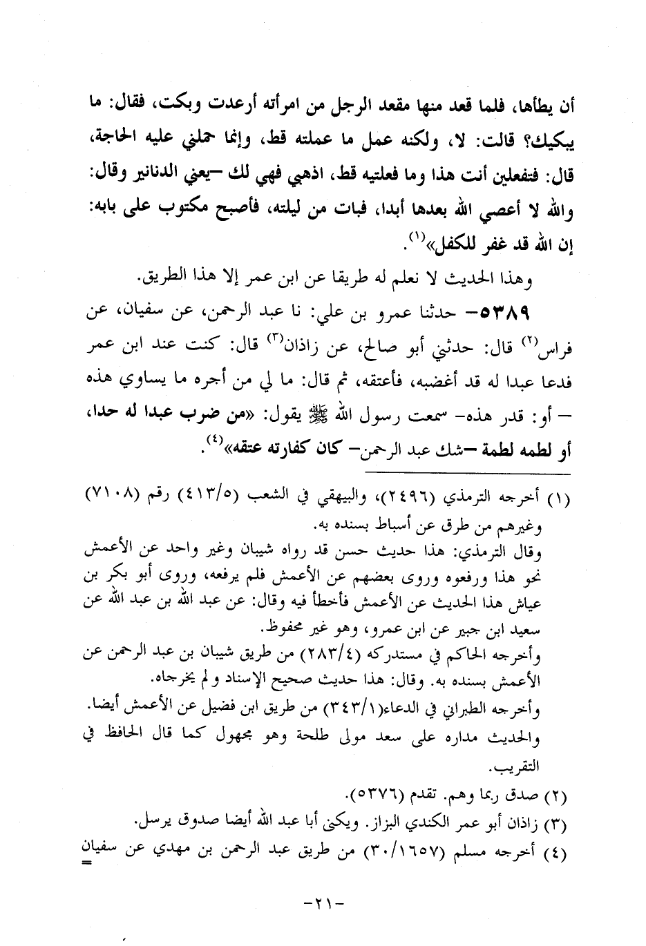 5389- حَدَّثَنا عَمْرُو بْنُ عَلِيٍّ، حَدَّثنا عَبد الرَّحْمَنِ، عَن سُفيان، عَن فِرَاسٍ قَالَ: حَدَّثَنِي أَبُو صَالِحٍ، عَن زَاذَانَ قَالَ: كُنْتُ عِنْدَ ابْنِ عُمَر فَدَعَا عَبدا لَهُ قَدْ أَغْضَبَهُ فَأَعْتَقَهُ، ثُمَّ قَالَ: مَا لِي مِنْ أَجْرِهِ مَا يُسَاوِي هَذِهِ، أَوْ: قَدْرَ هَذِهِ، سَمِعْتُ رَسُولَ اللَّهِ صَلَّى اللَّهُ عَلَيه وَسَلَّم يَقُولُ: مَنْ ضَرَبَ عَبدا لَهُ حَدًّا، أَوْ لَطَمَهُ لَطْمَةً، شَكَّ عَبد الرَّحْمَنِ، كَانَ كَفَّارَتُهُ عِتْقَهُ.