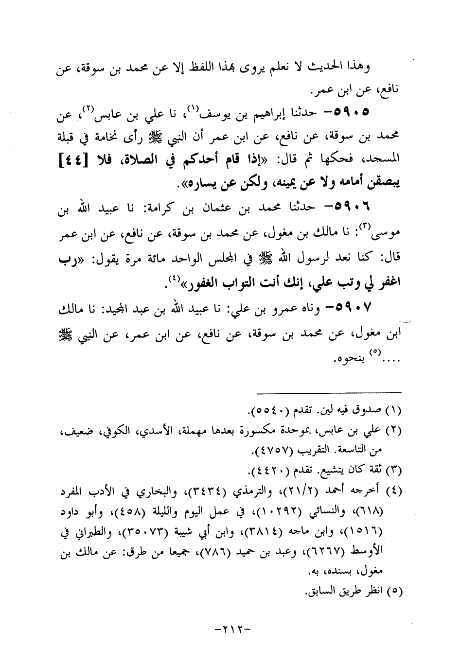5906- حَدَّثنا مُحَمد بن عُثمَان بن كرامة، حَدَّثنا عُبَيد الله بن موسى، حَدَّثنا مَالِك بْنُ مِغْوَل، عَن مُحَمد بْنِ سُوقَةَ، عَن نافعٍ، عَن ابْنِ عُمَر قَالَ: كُنَّا نَعُدُّ لِرَسُولِ اللهِ صَلَّى اللَّهُ عَلَيه وَسَلَّم، فِي الْمَجْلِسِ الوَاحِدِ، مِئَةُ مَرَّةٍ، يَقُولُ: رَبِّ اغْفِرْ لِي، وَتُبْ عَلَيَّ، إنَّك أَنْتَ التَّوَّابُ الْغَفُورُ.