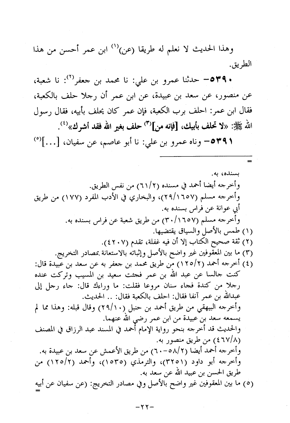 5391- وحَدَّثناه عَمْرو بن علي، حَدَّثنا أَبُو عَاصِم، عَن سُفيان، (عَنْ) (1) مَنْصُورٍ، عَن سَعْد بْنِ عُبَيْدَةَ، عَن ابْنِ عُمَر، عَن النَّبِيّ صَلَّى اللَّهُ عَلَيه وَسَلَّم قال: من (2) حلف بـ (غير الله فقد) (2) أشرك.