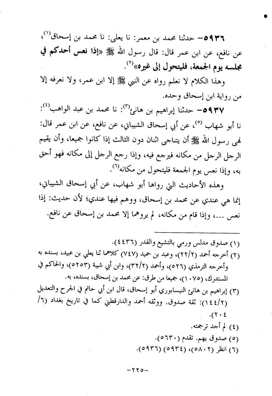 5936- حَدَّثنا مُحَمد بن مَعْمَر، حَدَّثنا يَعْلَى، حَدَّثنا مُحَمد بْنُ إِسْحَاقَ، عَن نافعٍ، عَن ابِن عُمَر قَالَ: قَالَ رَسُول اللهِ صَلَّى اللَّهُ عَلَيه وَسَلَّم: إِذَا نَعَسَ أَحَدُكُمْ فِي مَجْلِسِهِ يَوْمَ الْجُمُعَةِ، فَلْيَتَحَوَّلْ إِلَى غَيْرِهِ.