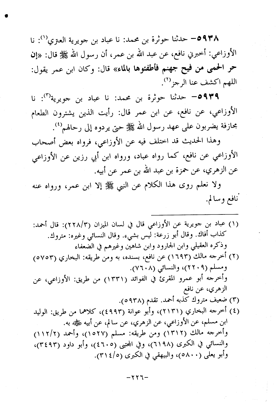5938- حَدَّثنا حوثرة بن مُحَمد، حَدَّثنا عباد بن جويرية الْعَنَزِيُّ، حَدَّثنا الأَوزَاعِيّ: أَخْبَرَنِي نَافِعٌ، عَن عَبد اللَّهِ بْنِ عُمَر أَن رَسولَ اللهِ صَلَّى اللَّهُ عَلَيه وَسَلَّم قَالَ: إِنَّ حَرَّ الْحُمَّى مِنْ فَيْحِ جَهَنَّمَ فَأَطْفِئُوهَا بِالْمَاءِ.