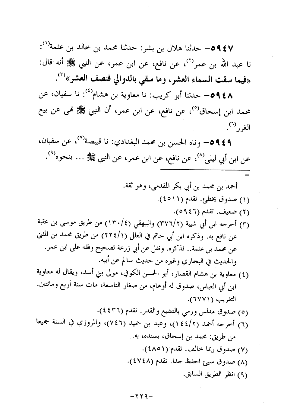5947- حَدَّثنا هِلالُ بْنُ بِشْرٍ: حَدَّثنا مُحَمد بْنُ خالد بن عثمة، حَدَّثنا عَبد اللَّهِ بْنُ عُمَر، عَن نافعٍ، عَن ابْنِ عُمَر، عَن النَّبِيّ صَلَّى اللَّهُ عَلَيه وَسَلَّم؛ أَنَّه قَالَ: فِيمَا سَقَتِ السَّمَاءُ الْعُشْرُ وَمَا سُقِيَ بِالدَّوَالِي فَنِصْفُ الْعُشْرِ.