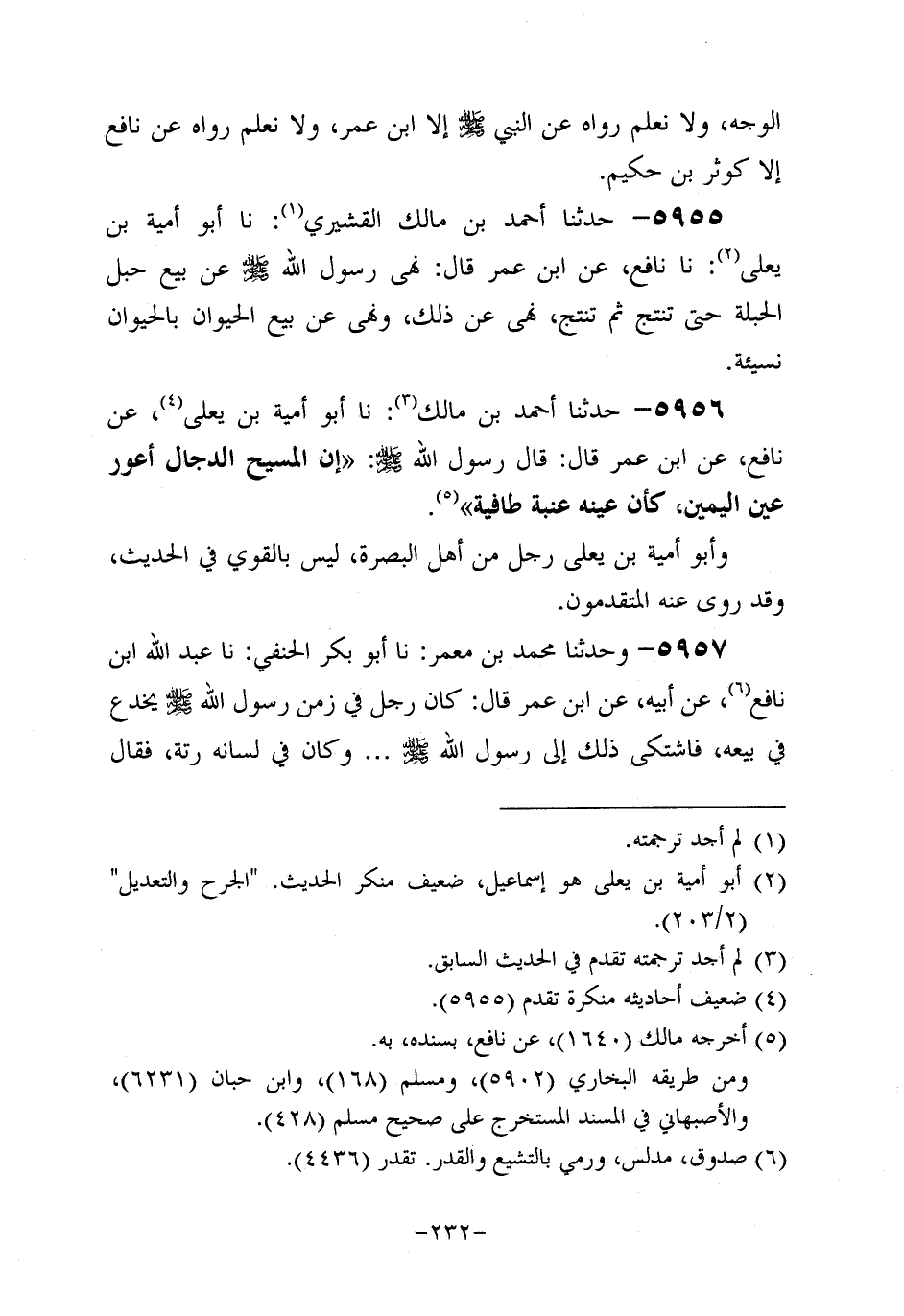 5955- حَدَّثنا أحمد بن مالك القشيري، حَدَّثنا أَبُو أمية بن يَعْلَى، حَدَّثنا نَافِعٍ، عَن ابْنِ عُمَر قَالَ: نَهَى رَسُولُ اللهِ صَلَّى اللَّهُ عَلَيه وَسَلَّم عَن بَيْعِ حَبَل الحَبَلَة حَتَّى تَنْتِجَ، ثُمَّ تَنْتِجَ نَهَى عَن ذَلِكَ، وَنَهَى عَن بَيْعِ الْحَيَوَانِ بِالْحَيَوَانِ نسيئة.