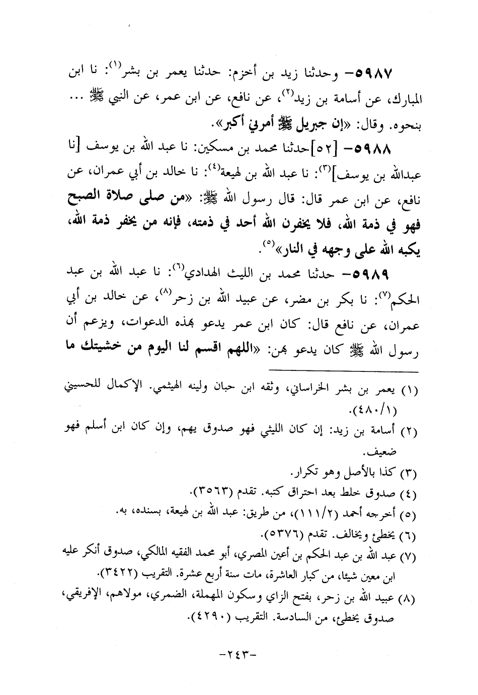 5988- حَدَّثنا مُحَمد بن مسكين، حَدَّثنا عَبد الله بن يوسف، حَدَّثنا عَبد الله بن يوسف , حَدَّثنا عَبد الله بن لهيعة، حَدَّثنا خَالِدُ بْنُ أَبِي عِمْرَانَ، عَن نافعٍ، عَن ابْنِ عُمَر قَالَ: قَالَ رَسُول اللهِ صَلَّى اللَّهُ عَلَيه وَسَلَّم: مَنْ صَلَّى صَلاةَ الصُّبْحِ فَهُوَ فِي ذِمَّةِ اللَّهِ فَلا يَخْفِرَنَّ اللَّهَ أَحَدٌ فِي ذِمَّتِهِ فَإِنَّهُ مَنْ يَخْفِرْ ذِمَّةَ اللَّهِ يُكِبَّهُ اللَّهُ عَلَى وَجْهِهِ فِي النَّارِ.