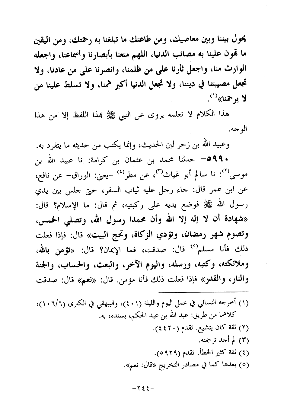 5990- حَدَّثنا مُحَمد بن عُثمَان بن كرامة، حَدَّثنا عُبَيد الله بن موسى، حَدَّثنا سَالِمٌ أَبُو غِيَاثٍ، عَن مَطَرٍ يَعْنِي: الْوَرَّاقَ، عَن نافعٍ، عَن ابْنِ عُمَر قَالَ: جَاءَ رَجُلٌ عَلَيْهِ ثِيَابُ السَّفَرِ حَتَّى جَلَسَ بَيْنَ يَدَيْ رَسُولِ اللَّهِ صَلَّى اللَّهُ عَلَيه وَسَلَّم فَوَضَعَ يَدَيْهِ عَلَى رُكْبَتَيْهِ، ثُمَّ قَالَ: مَا الإِسْلامُ؟ قَالَ: شَهَادَةُ أَنَّ لا إِلَهَ إلاَّ اللَّهُ وَأَنَّ مُحَمَّدًا رَسُولُ اللَّهِ وَتُصَلِّي الْخَمْسَ وَتَصُومُ شَهْرَ رَمَضَانَ وَتُؤَدِّي الزَّكَاةَ وَتَحُجَّ الْبَيْتَ قَالَ: فَإِذَا فَعَلْتُ ذَلِكَ فَأَنَا مُسْلِمٌ قَالَ: صَدَقْتَ فَمَا الإِيمَانُ؟ قَالَ: تُؤْمِنُ بِاللَّهِ وَمَلائِكَتِهِ وَكُتُبِهِ وَرُسُلِهِ وَالْيَوْمِ الآخِرِ وَالْبَعْثِ وَالْحِسَابِ وَالْجَنَّةِ وَالنَّارِ وَالْقَدَرِ فَإِذَا فَعَلْتُ ذَلِكَ فَأَنَا مُؤْمِنٌ. قَالَ: نَعَمْ قَالَ:صَدَقْتَ، قَالَ: فَمَا الإِحْسَانُ؟ قَالَ: تَعْبُدُ اللَّهَ كَأَنَّكَ تَرَاهُ فَإِنْ لَمْ تَكُنْ تَرَاهُ فَإِنَّهُ يَرَاكَ قَالَ: فَإِذَا فَعَلْتُ ذَلِكَ فَأَنَا مُحْسِنٌ. قَالَ: نَعَمْ قَالَ: صَدَقْتَ قَالَ: فَمَتَى السَّاعَةُ؟ قَالَ: وَالَّذِي نَفْسِي بِيَدِهِ ما المسؤُول عَنْهَا بِأَعْلَمَ مِنَ السَّائِلِ وَسَأُخْبِرُكَ بِأَشْرَاطِهَا: إِذَا رَأَيْتَ الْحُفَاةَ الْعُرَاةَ، يَعْنِي الْعَرَبَ أَحْسِبُهُ قَالَ، يَتَطَاوَلُونَ فِي الْبُنْيَانِ قَالَ: وَخَرَجَ فَقَالَ رَسُولُ اللَّهِ صَلَّى اللَّهِ عَلَيه وَسَلَّم: عَلَيَّ الرَّجُلِ فَخَرَجْنَا فَلَمْ نَرَ أَحَدًا. فَقَالَ رَسُولُ اللَّهِ صَلَّى اللَّهُ عَلَيه وَسَلَّم: هَذَا جِبْرِيلُ جَاءَكُمْ يُعَلِّمُكُمْ دِينَكُمْ مَا أَتَانِي فِي مِثْلِ صُورَتِهِ الَيْوَم قَطُّ.