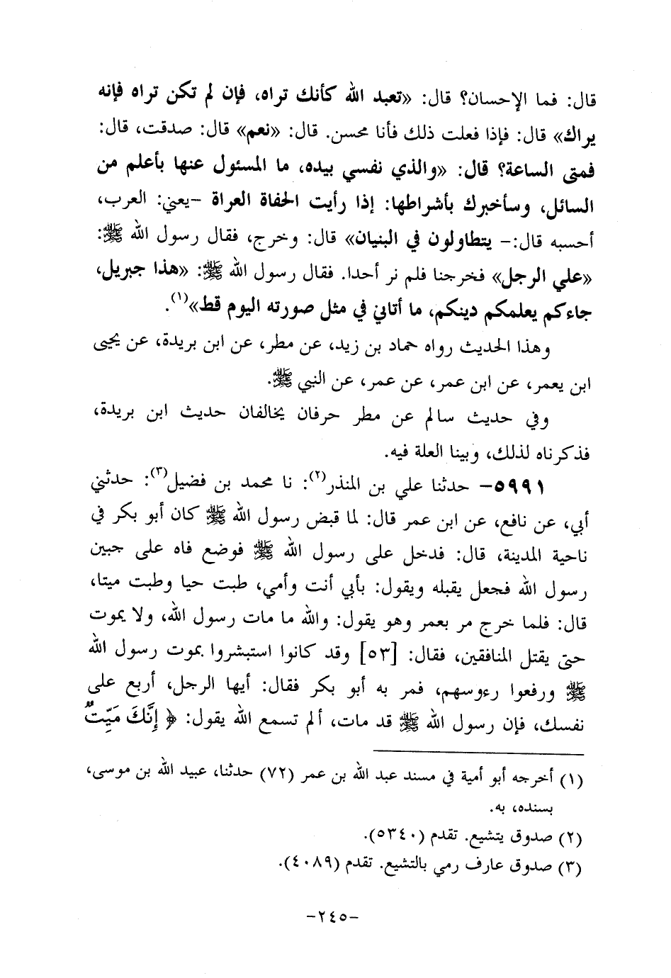 5991- حَدَّثَنَا عَلِيُّ بْنُ الْمُنْذِرِ، حَدَّثَنَا مُحَمَّدُ بْنُ فُضَيْلٍ، حَدَّثَنِي أَبِي، عَنْ نَافِعٍ، عَنِ ابْنِ عُمَرَ قَالَ: لَمَّا قُبِضَ رَسُولُ اللهِ صَلَّى اللَّهُ عَلَيْهِ وَسَلَّمَ كَانَ أَبُو بَكْرٍ، فِي نَاحِيَةِ الْمَدِينَةِ قَالَ: فَدَخَلَ عَلَى رَسُولِ اللهِ صَلَّى اللَّهُ عَلَيْهِ وَسَلَّمَ فَوَضَعَ فَاهُ عَلَى جَبِينِ رَسُولِ اللهِ صَلَّى اللَّهُ عَلَيْهِ وَسَلَّمَ فَجَعَلَ يُقَبِّلُهُ وَيَقُولُ: بِأَبِي أَنْتَ وَأُمِّي، طِبْتَ حَيًّا وَطِبْتَ مَيِّتًا، قَالَ: فَلَمَّا خَرَجَ مَرَّ بِعُمَرَ، وَهُوَ يَقُولُ: وَاللَّهِ مَا مَاتَ رَسُولُ اللهِ صَلَّى اللَّهُ عَلَيْهِ وَسَلَّمَ وَلاَ يَمُوتُ حَتَّى يَقْتُلَ الْمُنَافِقِينَ، فقَالَ: وَقَدْ كَانُوا اسْتَبْشَرُوا بِمَوْتِ رَسُولِ اللهِ صَلَّى اللَّهُ عَلَيْهِ وَسَلَّمَ وَرَفَعُوا رُؤُوسَهُمْ فَمَرَّ بِهِ أَبُو بَكْرٍ فَقَالَ: أَيُّهَا الرَّجُلُ: أَرْبِعْ عَلَى نَفْسِكِ فَإِنَّ رَسُولَ اللهِ صَلَّى اللَّهُ عَلَيْهِ وَسَلَّمَ قَدْ مَاتَ، أَلَمْ تَسْمَعِ اللَّهَ يَقُولُ {إِنَّكَ مَيِّتٌ وَإِنَّهُمْ مَيِّتُونَ} ، {وَمَا جَعَلْنَا لِبَشَرٍ مِنْ قَبْلِكَ الْخُلْدَ أَفَإِنْ مِتَّ فَهُمُ الْخَالِدُونَ} قَالَ: وَأَتَى الْمِنْبَرَ فَصَعِدَ فَحَمِدَ اللَّهَ وَأَثْنَى عَلَيْهِ، ثُمَّ قَالَ: أَيُّهَا النَّاسُ إِنْ كَانَ مُحَمَّدٌ إِلَهَكُمُ الَّذِي تَعْبُدُونَ فَإِنَّ إِلَهَكُمْ قَدْ مَاتَ، وَإِنْ كَانَ إِلَهُكُمُ اللَّهَ الَّذِي فِي السَّمَاءِ فَإِنَّ إِلَهَكُمْ حَيٌّ لاَ يَمُوتُ. قَالَ: ثُمَّ تَلاَ {وَمَا مُحَمَّدٌ إِلاَّ رَسُولٌ قَدْ خَلَتْ مِنْ قَبْلِهِ الرُّسُلُ} حَتَّى خَتَمَ الآيَةَ قَالَ: ثُمَّ نَزَلَ وَقَدِ اسْتَبْشَرَ الْمُؤْمِنُونَ بِذَلِكَ وَاشْتَدَّ فَرَحُهُمْ وَأَخَذَ الْمُنَافِقِينَ الْكَآبَةُ.