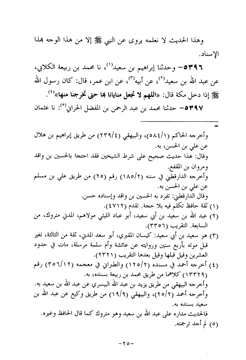 5396- وَحَدَّثَنَا إِبْرَاهِيمُ بْنُ سَعِيدٍ، حَدَّثَنَا مُحَمَّدُ بْنُ رَبِيعَةَ الْكِلابِيُّ، عَنْ عَبْدِ اللهِ بْنِ سَعِيدٍ، عَنْ أَبِيهِ، عَنِ ابْنِ عُمَرَ، قَالَ: كَانَ رَسُولُ اللهِ صَلَّى اللَّهُ عَلَيْهِ وَسَلَّمَ إِذَا دَخَلَ مَكَّةَ، قَالَ: اللَّهُمَّ لا تَجْعَلْ مَنَايَانَا بِهَا حَتَّى تُخْرِجْنَا مِنْهَا.