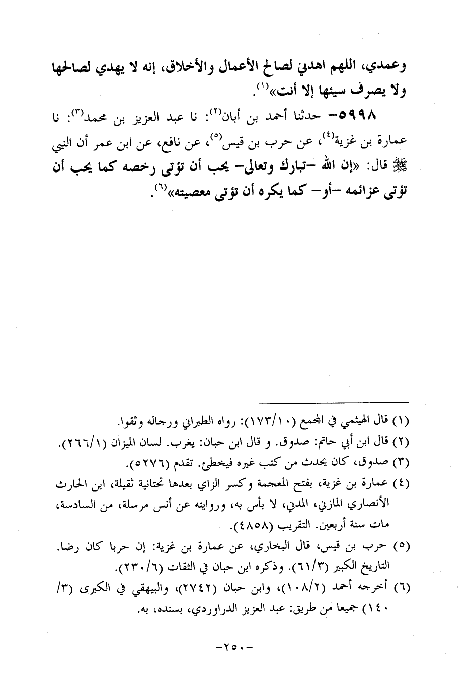 5998- حَدَّثَنَا أَحْمَدُ بْنُ أَبَانَ، حَدَّثَنَا عَبْدُ الْعَزِيزِ بْنُ مُحَمَّدٍ، حَدَّثَنَا عُمَارَةُ بْنُ غَزِيَّةَ، عَنْ حَرْبِ بْنِ قَيْسٍ، عَنْ نَافِعٍ، عَنِ ابْنِ عُمَرَ، أَنَّ النَّبِيَّ صَلَّى اللَّهُ عَلَيْهِ وَسَلَّمَ قَالَ: إِنَّ اللَّهَ تَبَارَكَ وَتَعَالَى يُحِبُّ أَنْ تُؤْتَى رُخَصُهُ، كَمَا يُحِبُّ أَنْ تُؤْتَى عَزَائِمُهُ، أَوْ كَمَا يَكْرَهُ أَنْ تُؤْتَى مَعْصِيَتُهُ.