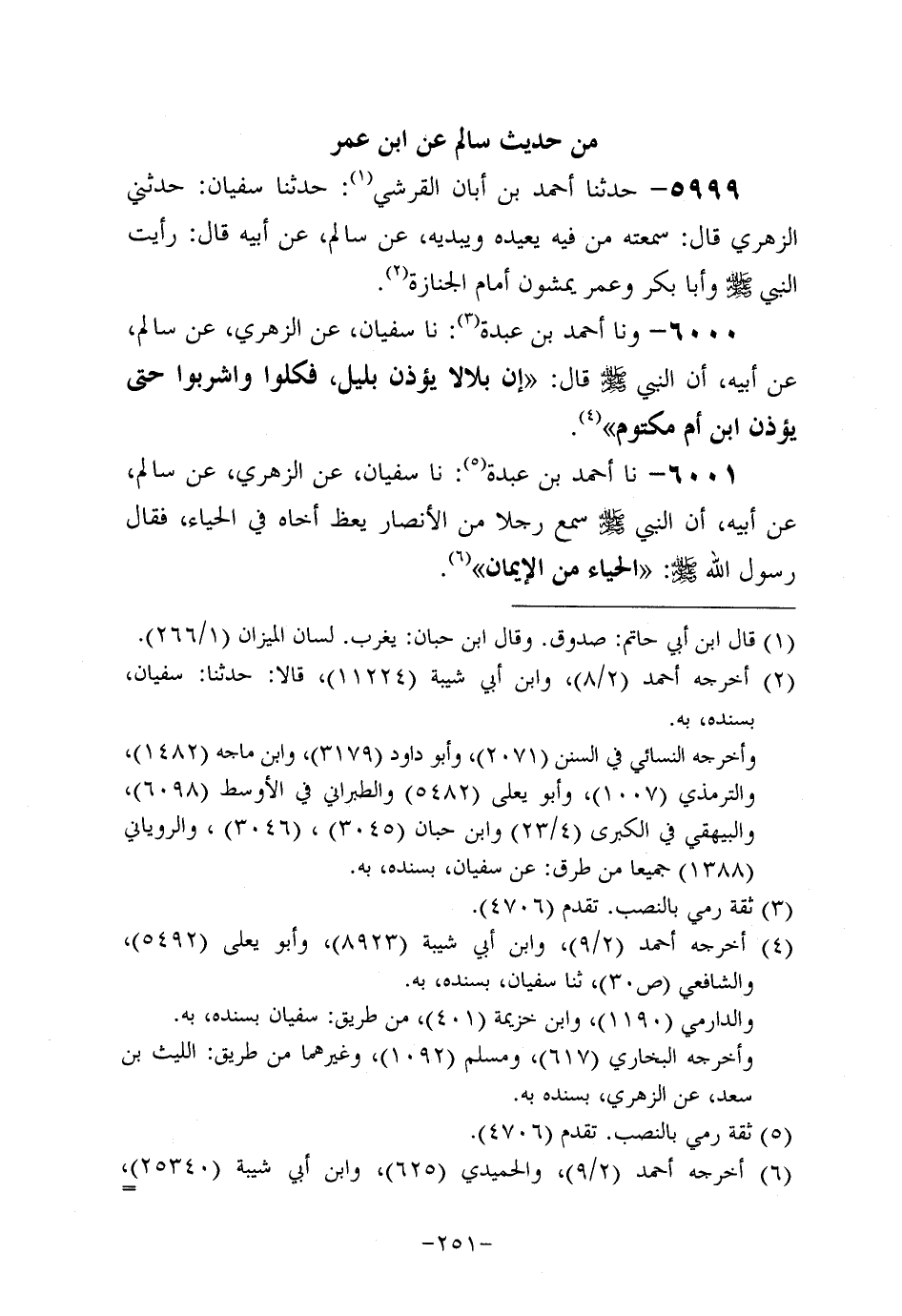 5999- حَدَّثنا أَحْمَدُ بْنُ أَبَان الْقُرَشِيُّ: حَدَّثنا سُفيان: حَدَّثَنِي الزُّهْرِيّ قَالَ: سَمِعْتُهُ مِنْ فِيهِ يُعِيدُهُ وَيُبْدِيهِ، عَنْ سَالِمٍ، عَنْ أَبِيهِ، قَال: رَأَيْتُ النَّبِيّ صَلَّى اللَّهُ عَلَيه وَسَلَّم وَأَبَا بَكْرٍ وَعُمَرَ يمشون أمام الجنازة.