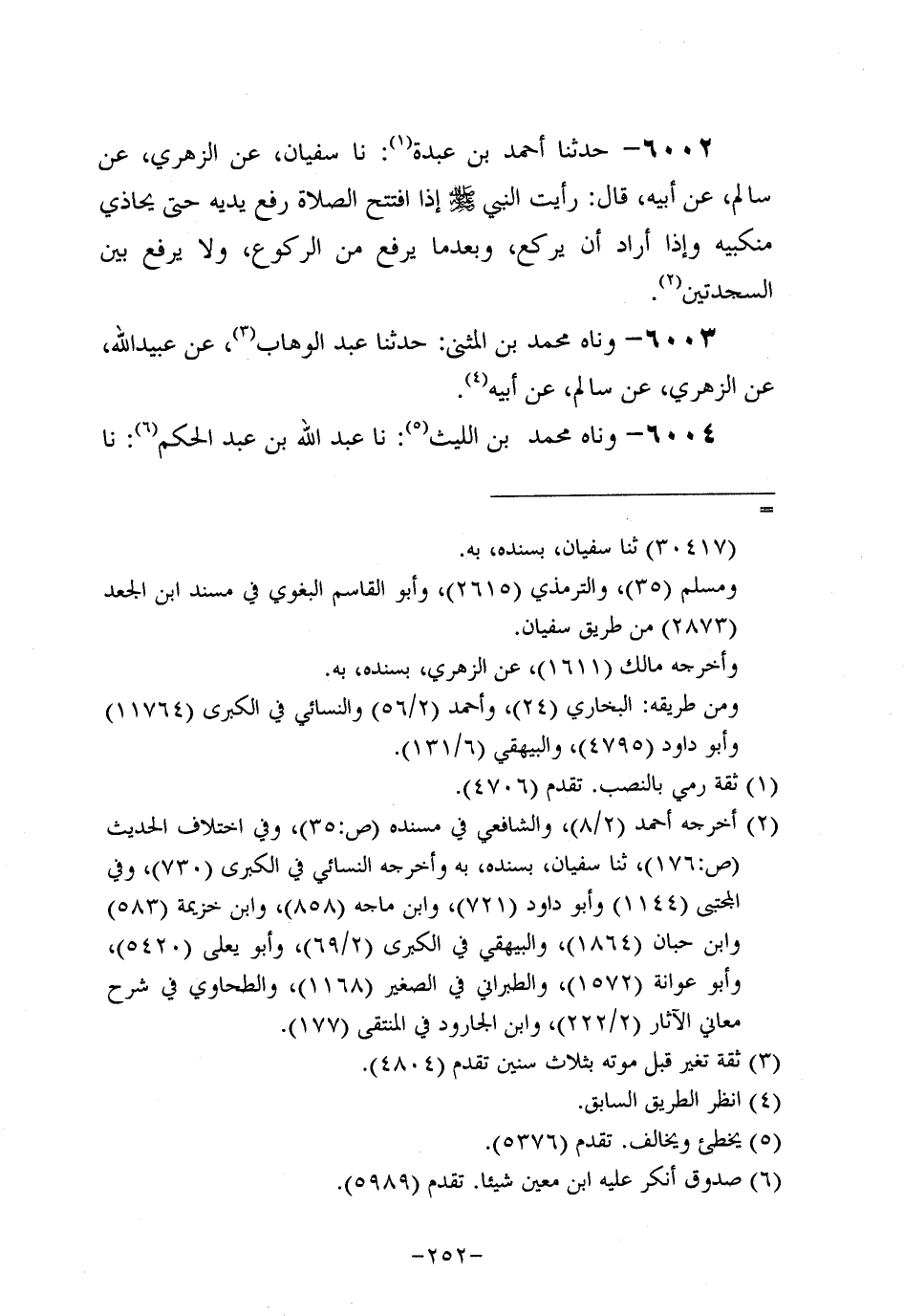 6002- حَدَّثنا أَحْمَدُ بْنُ عَبْدَةَ، حَدَّثَنا سُفْيَانُ، عَن الزُّهْرِيّ، عَنْ سَالِمٍ، عَنْ أَبِيهِ، قَال: رَأَيْتُ النَّبِيّ صَلَّى اللَّهُ عَلَيه وَسَلَّم إِذَا افْتَتَحَ الصَّلاةَ رَفَعَ يَدَيْهِ حَتَّى يُحَاذِيَ منكبيه، وإذا أراد أن يركع وبعدما يَرْفَعُ مِنَ الرُّكُوعِ، ولاَ يَرْفَعُ بَيْنَ السَّجْدَتَيْنِ.
