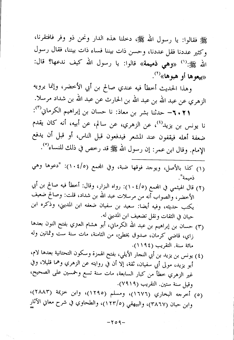 6021- حَدَّثنا بِشْر بن معاذ، حَدَّثنا حسان بن إبراهيم الكرماني، حَدَّثنا يُونُسُ بْنُ يَزِيدَ، عَن الزُّهْرِيّ، عَنْ سَالِمٍ، عَنْ أَبِيهِ أَنَّهُ كَانَ يُقَدِّمُ ضَعَفَةَ أَهْلِهِ فَيَقِفُونَ عِنْدَ الْمَشْعَرِ فَيَدْفَعُونَ قَبْلَ النَّاسِ، أَوْ قَبْلَ أَنْ يَدْفَعَ الإِمَامُ، وَقال ابْنُ عُمَر: أَنَّ رَسُولَ اللَّهِ صَلَّى اللَّهُ عَلَيه وَسَلَّم قَدْ رَخَّصَ فِي ذَلِكَ لِلنِّسَاءِ.