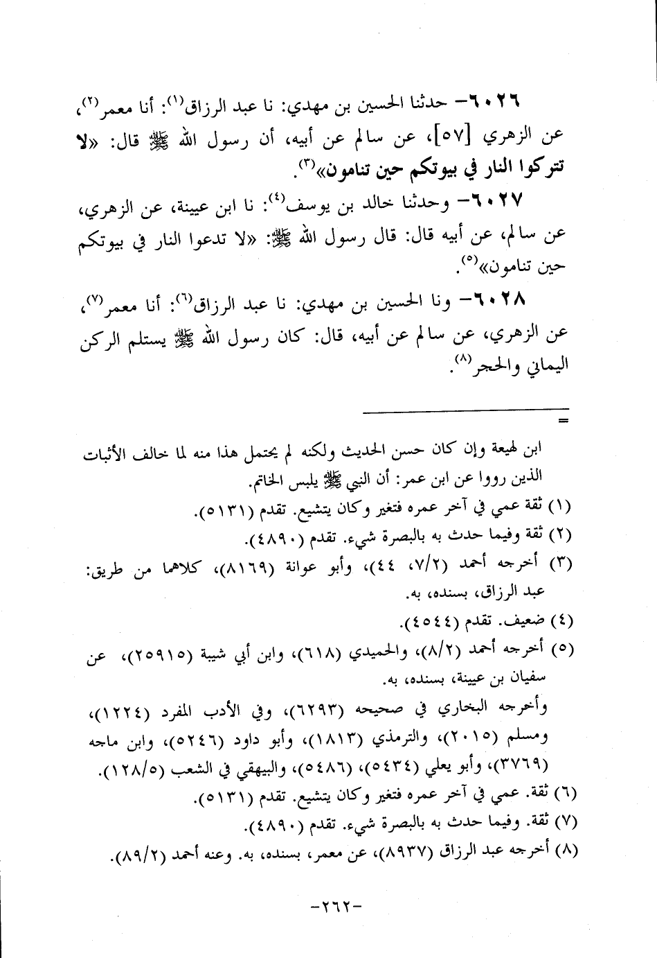 6026- حَدَّثنا الحسين بن مهدي، حَدَّثنا عَبد الرَّزَّاق، أخبرَنا مَعْمَر، عَن الزُّهْرِيّ، عَنْ سَالِمٍ، عَنْ أَبِيهِ؛ أَنَّ رَسُولَ اللهِ صَلَّى اللَّهُ عَلَيه وَسَلَّم، قَال: لاَ تَتْرُكُوا النَّارَ فِي بُيُوتِكُمْ حِينَ تَنَامُونَ.
