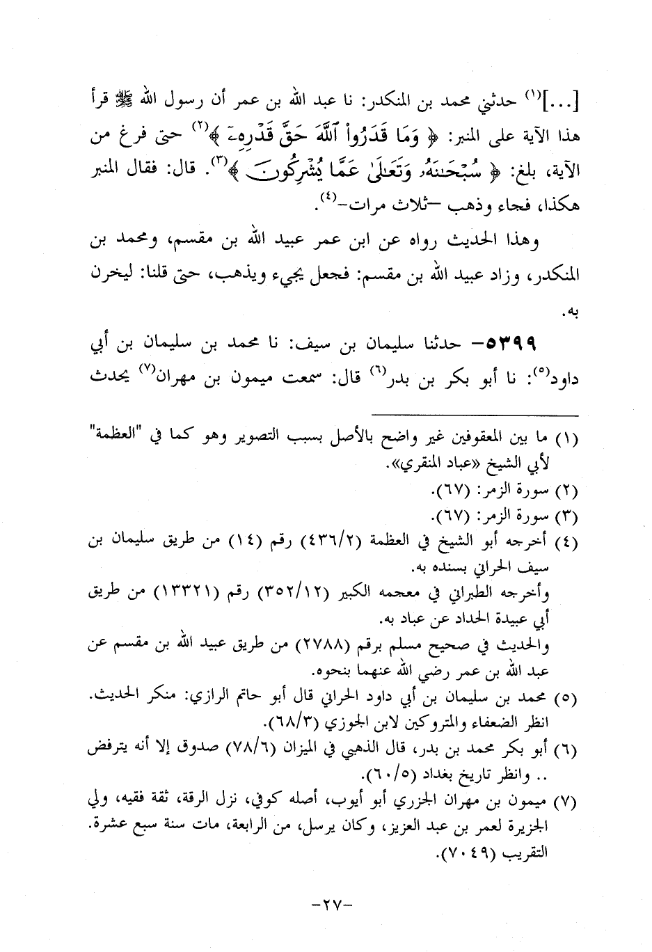 5399- حَدَّثنا سليمان بن سيف، حَدَّثنا مُحَمد بن سليمان بن أبي داود، حَدَّثنا أَبُو بَكْرِ بْنُ بَدْرٍ، قَالَ: سَمِعْتُ مَيْمُونَ بْنَ مِهْرَانَ يُحَدِّثُ، قَالَ: سَمِعْتُ ابْنَ عُمَر قَالَ: رَأَيْتُ رَسُولَ اللَّهِ صَلَّى اللَّهُ عَلَيه وَسَلَّم يُحْفِي شَارِبَهُ.