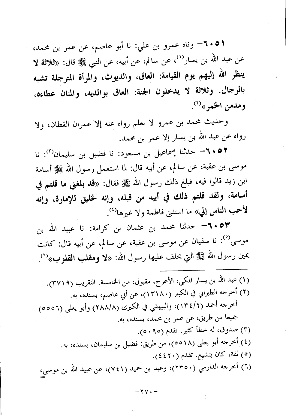 6051- وحَدَّثناه عَمْرو بن علي: أَخْبَرَنَا أَبُو عَاصِم، عَن عُمَر بْنِ مُحَمد، عَن عَبد اللَّهِ بْنِ يَسَارٍ، عَنْ سَالِمٍ، عَنْ أَبِيهِ، عَن النَّبِيّ صَلَّى اللَّهُ عَلَيه وَسَلَّم قَالَ: ثَلاثَةٌ لا يَنْظُرُ اللَّهُ إِلَيْهِمْ يَوْمَ الْقِيَامَةِ: الْعَاقُّ وَالدَّيُّوثُ وَالْمَرْأَةُ الْمُتَرَجِّلَةُ تَشَبَّهُ بِالرِّجَالِ وَثَلاثَةٌ لا يَدْخُلُونَ الْجَنَّةَ: الْعَاقُّ بِوَالِدَيْهِ وَالْمَنَّانُ عَطَاءَهُ وَمُدْمِنُ الْخَمْرِ.