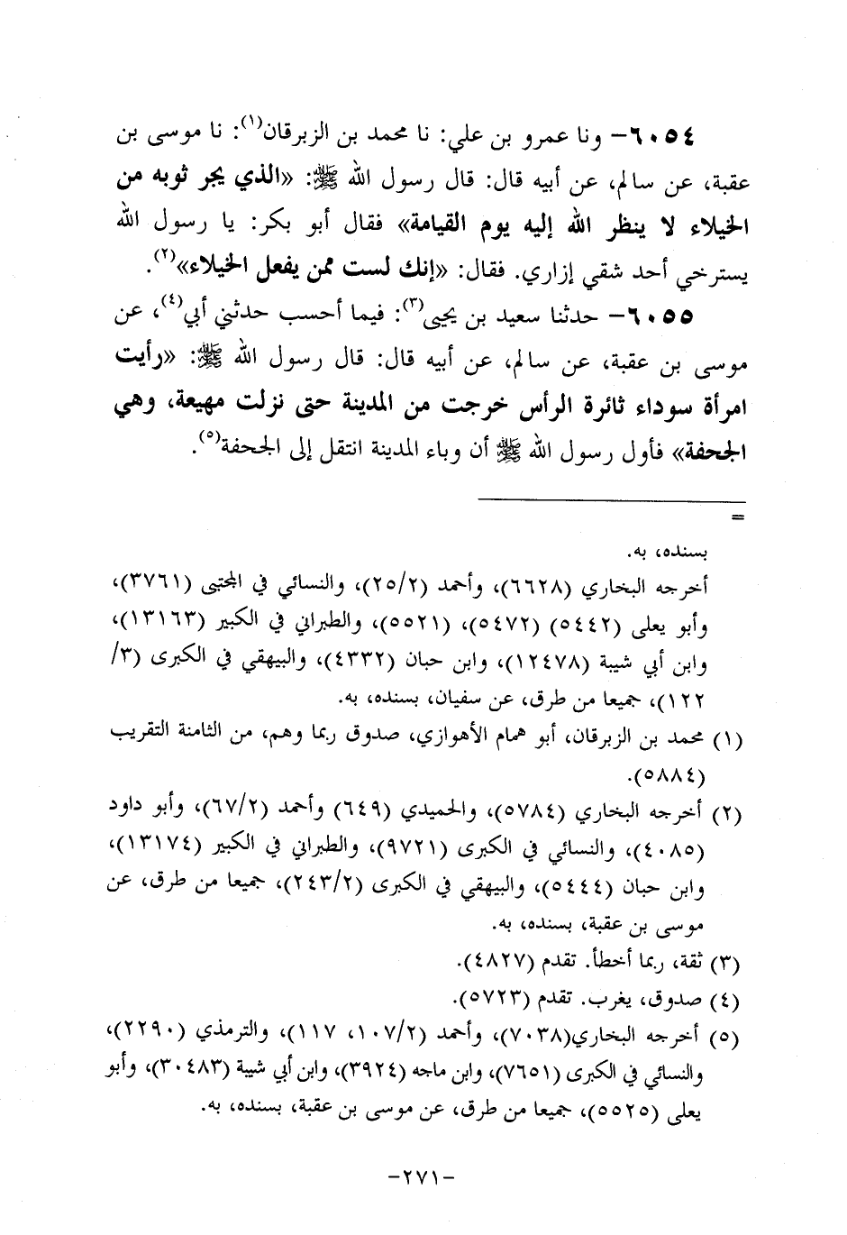 6054- وحَدَّثَنا عَمْرُو بْنُ عَلِيٍّ، حَدَّثنا مُحَمد بن الزبرقان، حَدَّثنا مُوسَى بْنِ عُقْبَةَ، عَنْ سَالِمٍ، عَنْ أَبِيهِ، قَال: قَالَ رَسُول اللهِ صَلَّى اللَّهُ عَلَيه وَسَلَّم: الَّذِي يَجُرُّ ثَوْبَهُ مِنَ الْخُيَلاءِ لا يَنْظُرُ اللَّهُ إِلَيْهِ يَوْمَ الْقِيَامَةِ فَقَالَ أَبُو بَكْرٍ: يَا رَسولَ اللهِ , يَسْتَرْخِي أَحَدُ شِقَّيْ إِزَارِي فَقَالَ: إِنَّكَ لَسْتَ مِمَّنْ يَفْعَلُ الْخُيَلاءَ.