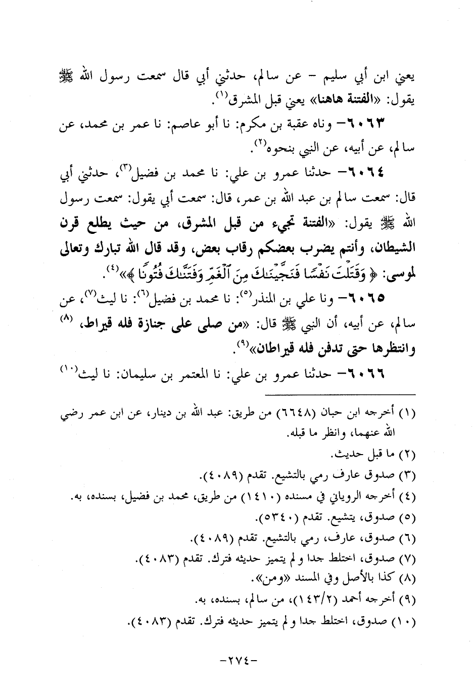 6064- حَدَّثَنا عَمْرُو بْنُ عَلِيٍّ، حَدَّثنا مُحَمد بْنُ فُضَيْلٍ حَدَّثَنِي أَبِي، قَالَ: سَمِعْتُ سَالِمَ بْنَ عَبد اللَّهِ بْنِ عُمَر، قَالَ: سَمِعْتُ أَبِي يَقُولُ: سَمِعْتُ رَسُولَ اللَّهِ صَلَّى اللَّهُ عَلَيه وَسَلَّم يَقُولُ: الْفِتْنَةُ تَجِيءُ مِنْ قِبَلِ الْمَشْرِقِ , مِنْ حَيْثُ يَطْلُعُ قَرْنُ الشَّيْطَانِ.