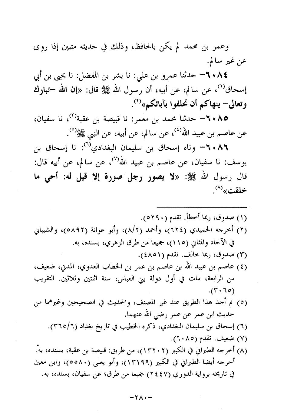 6086- وحَدَّثناه إسحاق بن سليمان البغدادي، حَدَّثنا إسحاق بن يوسف، حَدَّثنا سُفيان , عَن عَاصِم بْنِ عُبَيد اللَّهِ، عَنْ سَالِمٍ، عَنْ أَبِيهِ، قَال: قَالَ رَسُول اللهِ صَلَّى اللَّهُ عَلَيه وَسَلَّم: لا يُصَوِّرُ رَجُلٌ صُورَةً إلاَّ قِيلَ لَهُ: أَحْيِ مَا خَلَقْتَ.