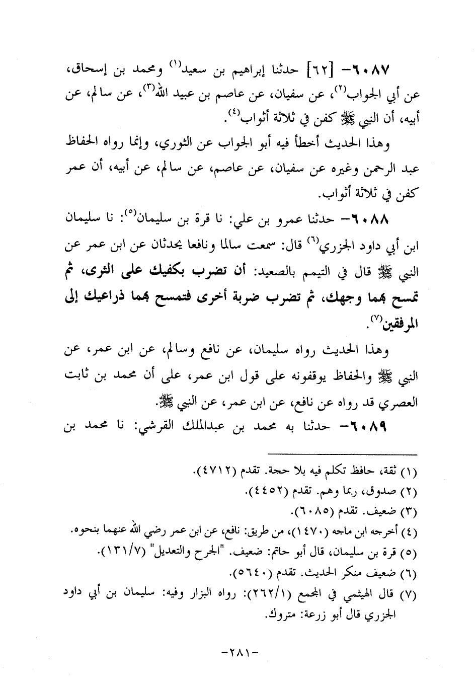 6088- حَدَّثَنا عَمْرُو بْنُ عَلِيٍّ، حَدَّثنا فروة بن سليمان، حَدَّثنا سُلَيْمَانُ بْنُ أَبِي دَاوُدَ الْجَزَرِيُّ، قَالَ: سَمِعْتُ سَالِمًا وَنَافِعًا يُحَدِّثَانِ، عَن ابْنِ عُمَر، عَن النَّبِيّ صَلَّى اللَّهُ عَلَيه وَسَلَّم قَالَ فِي التَّيَمُّمِ بِالصَّعِيدِ: أَنْ تَضْرِبَ بِكَفَّيْكَ عَلَى الثَّرَى، ثُمَّ تَمْسَحَ بِهِمَا وَجْهَكَ، ثُمَّ تَضْرِبَ ضَرْبَةً أُخْرَى فَتَمْسَحَ بِهِمَا ذِرَاعَيْكَ إِلَى الْمِرْفَقَيْنِ.