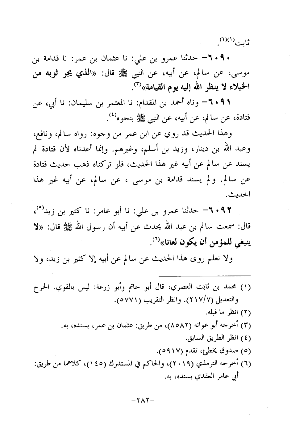 6090- حَدَّثَنا عَمْرُو بْنُ عَلِيٍّ، حَدَّثنا عُثمَان بن عُمَر، حَدَّثنا قُدَامَةُ بْنُ مُوسَى، عَنْ سَالِمٍ، عَنْ أَبِيهِ، عَن النَّبِيّ صَلَّى اللَّهُ عَلَيه وَسَلَّم قَالَ: الَّذِي يَجُرُّ ثَوْبَهُ مِنَ الْخُيَلاءِ لا يَنْظُرُ الله إليه يوم القيامة.