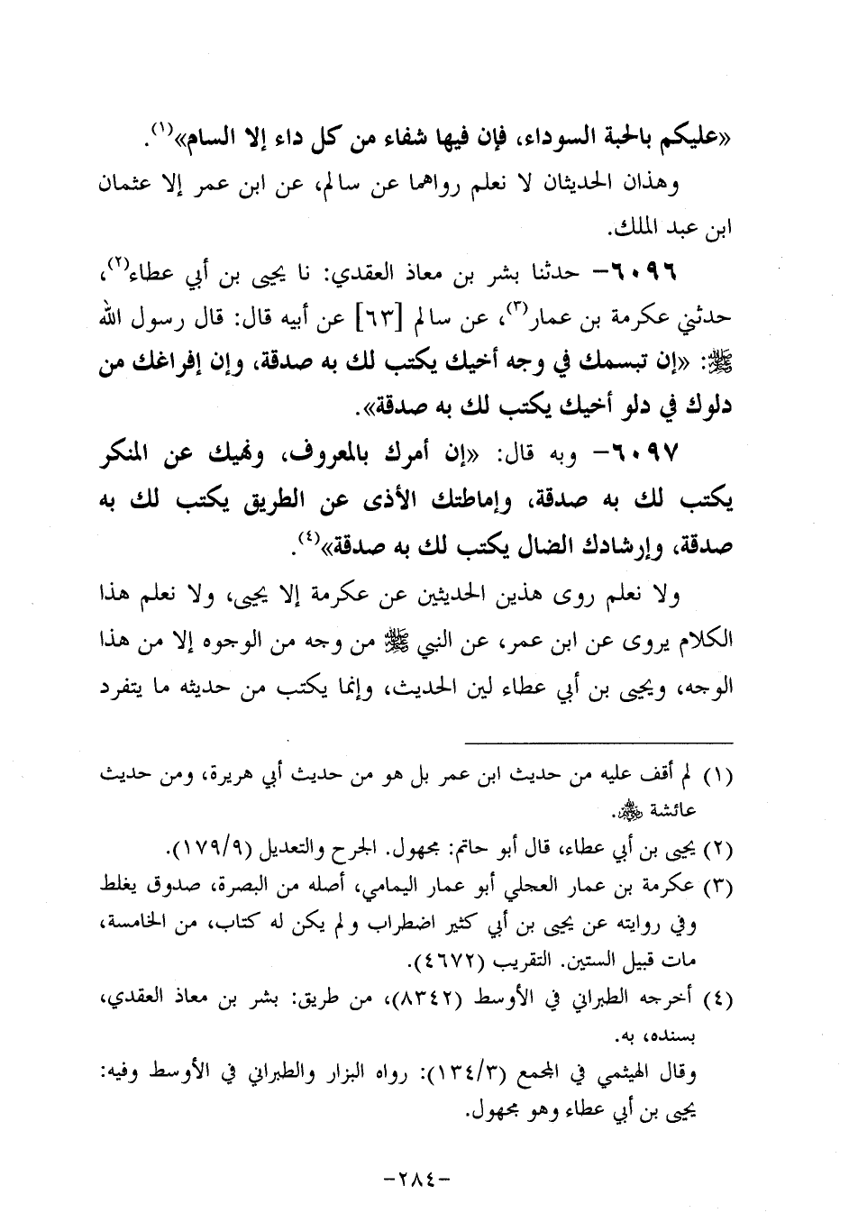 6096- حَدَّثنا بِشْر بن معاذ العقدي، حَدَّثنا يَحْيَى بْنُ أَبِي عَطَاءٍ حَدَّثَنِي عِكْرِمَةُ بْنُ عَمَّارٍ، عَنْ سَالِمٍ، عَنْ أَبِيهِ، قَال: قَالَ رَسُول اللهِ صَلَّى اللَّهُ عَلَيه وَسَلَّم: إِنَّ تَبَسُّمَكَ فِي وَجْهِ أَخِيكَ يُكْتَبُ لَكَ بِهِ صَدَقَةٌ، وَإن إِفْرَاغَكَ مِنْ دَلْوِكَ فِي دَلْوِ أَخِيكَ يُكْتَبُ لَكَ بِهِ صَدَقَةٌ.