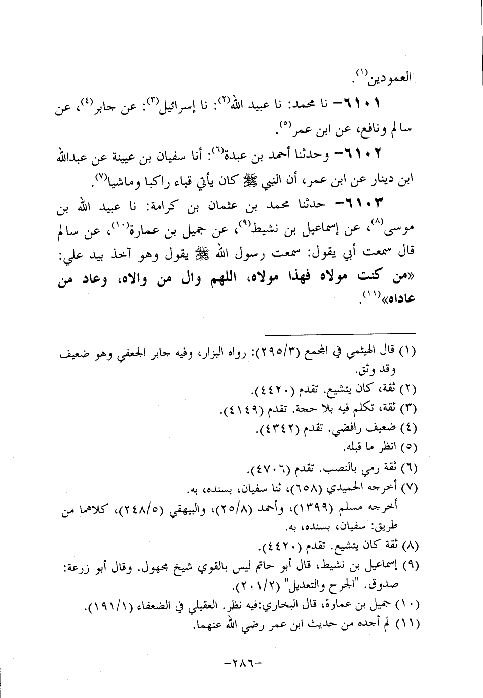 6103- حَدَّثنا مُحَمد بن عُثمَان بن كرامة، حَدَّثنا عُبَيد اللَّهِ بْنُ مُوسَى، عَن إِسْمَاعِيلَ بْنِ نَشِيطٍ، عَن جَمِيلِ بْنِ عُمَارَةَ، عَن سَالِمٍ، قَال: سَمعتُ أَبِي يَقُولُ: سَمِعْتُ رَسُولَ اللَّهِ صَلَّى اللَّهُ عَلَيه وَسَلَّم يَقُولُ، وهُو آخِذٌ بِيَدِ عَلِيٍّ: مَنْ كُنْتُ مَوْلاهُ فَهَذَا مَوْلاهُ اللَّهُمَّ وَالِ مَنْ وَالاهُ وَعَادِ مَنْ عَادَاهُ.