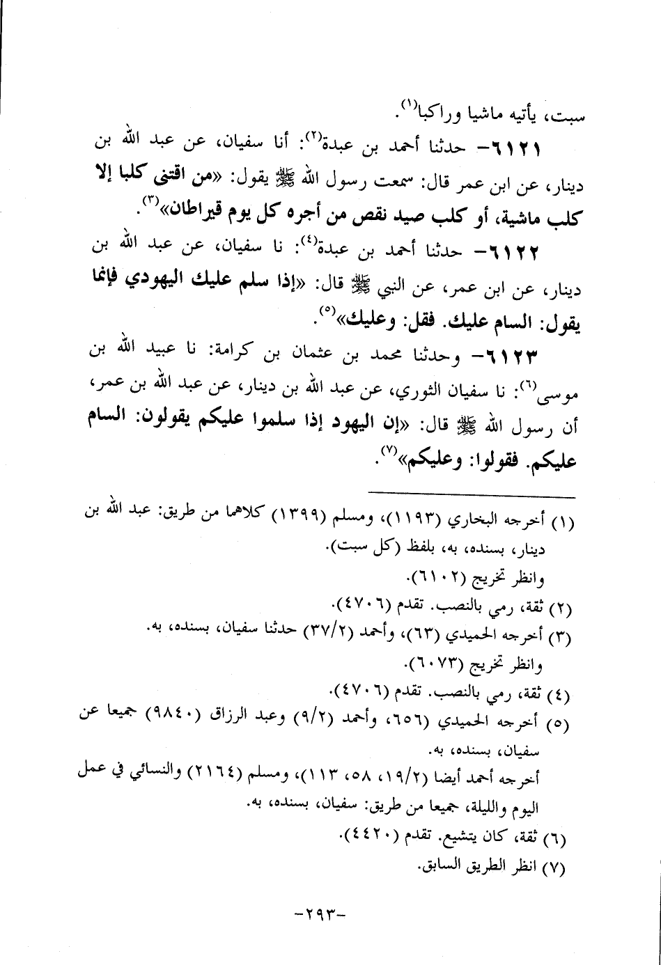 6122- حَدَّثنا أَحْمَدُ بْنُ عَبْدَةَ، حَدَّثَنا سُفْيَانُ، عَن عَبد اللَّهِ بْنِ دِينَارٍ، عَن ابْنِ عُمَر، عَن النَّبِيّ صَلَّى اللَّهُ عَلَيه وَسَلَّم قَالَ: إِذَا سَلَّمَ عَلَيْكَ الْيَهُودِيُّ، فَإِنَّمَا يَقُولُ: السَّامُ عَلَيْكَ، فَقُلْ: وَعَلَيْكَ.