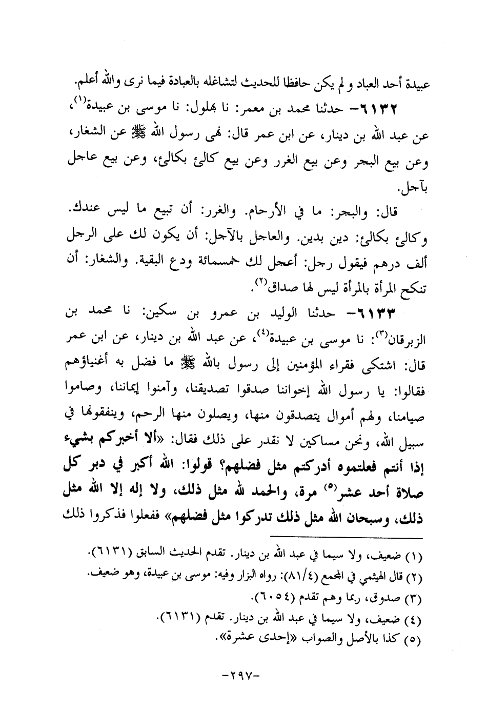 6133- حَدَّثنا الوليد بن عَمْرو بن سكين، حَدَّثنا مُحَمد بن الزبرقان، حَدَّثنا مُوسَى بْنُ عُبَيْدَةَ، عَن عَبد اللَّهِ بْنِ دِينَارٍ، عَن ابْنِ عُمَر قَالَ: اشْتَكَى فُقَرَاءُ الْمُؤْمِنِينَ إِلَى رَسُولِ اللَّهِ صَلَّى اللَّهُ عَلَيه وَسَلَّم مَا فُضِّلَ بِهِ أَغْنِيَاؤُهُمْ فَقَالُوا: يَا رَسولَ اللهِ إِخْوَانُنَا صَدَّقُوا تَصْدِيقَنَا وَآمَنُوا إِيمَانَنَا وَصَامُوا صِيَامَنَا وَلَهُمْ أَمْوَالٌ يَتَصَدَّقُونَ مِنْهَا وَيَصِلُونَ منه الرَّحِمَ وَيُنْفِقُونَهَا فِي سَبِيلِ اللَّهِ وَنَحْنُ مَسَاكِينُ لا نَقْدِرُ عَلَى ذَلِكَ فَقَالَ: أَلا أُخْبِرُكُمْ بِشَيْءٍ إِذَا أَنْتُمْ فَعَلْتُمُوهُ أَدْرَكْتُمْ مِثْلَ فَضْلِهِمْ؟ قُولُوا: اللَّهُ أَكْبَرُ فِي دُبُرِ كُلِّ صَلاةٍ أحد عشر مَرَّةً وَالْحَمْدُ للَّهِ مِثْلَ ذَلِكَ، ولاَ إِلَهَ إلاَّ اللَّهُ مِثْلَ ذَلِكَ وَسُبْحَانَ اللَّهِ مِثْلَ ذَلِكَ تُدْرِكُوا مِثْلَ فَضْلِهِمْ فَفَعَلُوا فَذَكَرُوا ذَلِكَ لِلأَغْنِيَاءِ فَعَمِلُوا مِثْلَ ذَلِكَ فَرَجَعَ الْفُقَرَاءُ إِلَى رَسُولِ اللَّهِ صَلَّى اللَّهُ عَلَيه وَسَلَّم فَذَكَرُوا ذَلِكَ لَهُ فَقَالَ: هَؤُلاءِ إِخْوَانُنَا فَعَلُوا مِثْلَ مَا نَقُولُ فَقَالَ: ذَلِكَ فَضْلُ اللَّهِ يُؤْتِيهِ مَنْ يَشَاءُ يَا مَعْشَرَ الْفُقَرَاءِ أَلا أُبَشِّرُكُمْ؟ إِنَّ فُقَرَاءَ الْمُسْلِمِينَ يَدْخُلُونَ الْجَنَّةَ قَبْلَ أَغْنِيَائِهِمْ بنصف يوم خمسمِئَة عَامٍ وَتَلا مُوسَى بْنُ عُبَيْدَةَ {وَإِنَّ يَوْمًا عند ربك كألف سنة مما يعدون} .