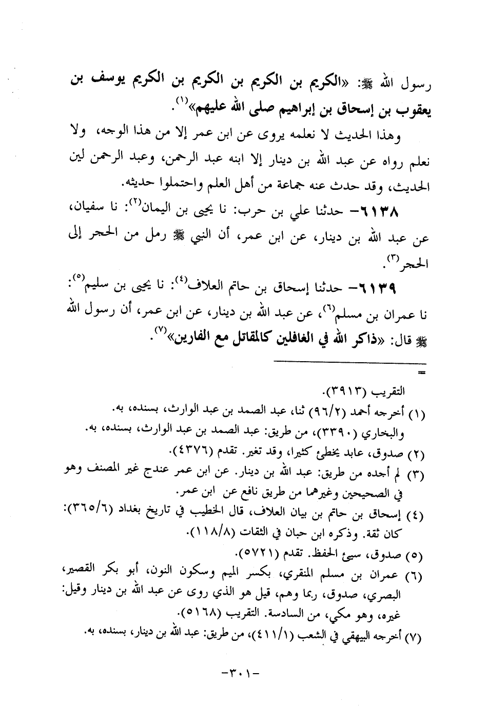 6139- حَدَّثنا إسحاق بن حاتم العلاف، حَدَّثنا يَحْيَى بن سُلَيْم، حَدَّثنا عِمْرَانُ بْنُ مُسْلِمٍ، عَن عَبد اللَّهِ بْنِ دِينَارٍ، عَن ابْنِ عُمَر؛ أَن رَسولَ اللهِ صَلَّى اللَّهُ عَلَيه وَسَلَّم قَالَ: ذَاكِرُ اللَّهِ فِي الْغَافِلِينَ كَالْمُقَاتِلِ مَعَ الْفَارِّينَ.