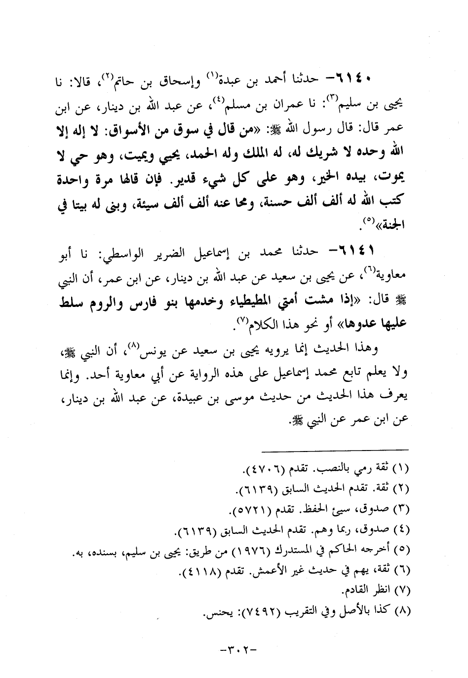 6140- حَدَّثنا أَحْمَدُ بْنُ عَبْدَةَ، وَإسحاق بْنُ حَاتِمٍ، قالاَ: حَدَّثنا يَحْيَى بن سُلَيْم، حَدَّثنا عِمْرَانُ بْنُ مُسْلِمٍ، عَن عَبد اللَّهِ بْنِ دِينَارٍ، عَن ابْنِ عُمَر قَالَ: قَالَ رَسُول اللهِ صَلَّى اللَّهُ عَلَيه وَسَلَّم: مَنْ قَالَ فِي سُوقٍ مِنَ الأَسْوَاقِ: لا إِلَهَ إلاَّ الله وحده لا شريك لَهُ الْمُلْكُ وَلَهُ الْحَمْدُ يَحْيَى وَيُمِيتُ، وهُو حَيٌّ لا يَمُوتُ بِيَدِهِ الْخَيْرُ، وهُو عَلَى كُلِّ شَيْءٍ قَدِيرٌ فَإِنْ قَالَهَا مَرَّةً وَاحِدَةً كَتَبَ اللَّهُ لَهُ أَلْفَ أَلْفِ حَسَنَةٍ وَمَحَا عَنْهُ أَلْفَ أَلْفِ سَيِّئَةٍ وَبُنِيَّ لَهُ بَيْتِا في الجنة.
