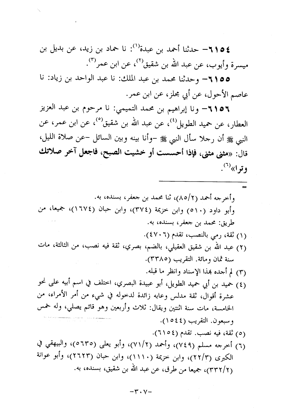 6156- وحَدَّثنا إبراهيم بن مُحَمد التميمي، حَدَّثنا مَرْحُومُ بْنُ عَبد الْعَزِيزِ الْعَطَّارُ، عَن حُمَيد الطَّوِيلِ، عَن عَبد اللَّهِ بْنِ شَقِيقٍ، عَن ابْنِ عُمَر، عَن النَّبِيّ صَلَّى اللَّهُ عَلَيه وَسَلَّم؛ أَنَّ رَجُلا سَأَلَ النَّبِيّ صَلَّى اللَّهُ عَلَيه وَسَلَّم، وَأنا بَيْنَهُ وَبَيْنَ السَّائِلِ، عَن صَلاةِ اللَّيْلِ قَالَ: مَثْنَى مَثْنَى فَإِذَا أَحْسَسْتَ، أَوْ خَشِيتَ الصُّبْحَ فَاجْعَلْ آخِرَ صَلاتِكَ وِتْرًا.