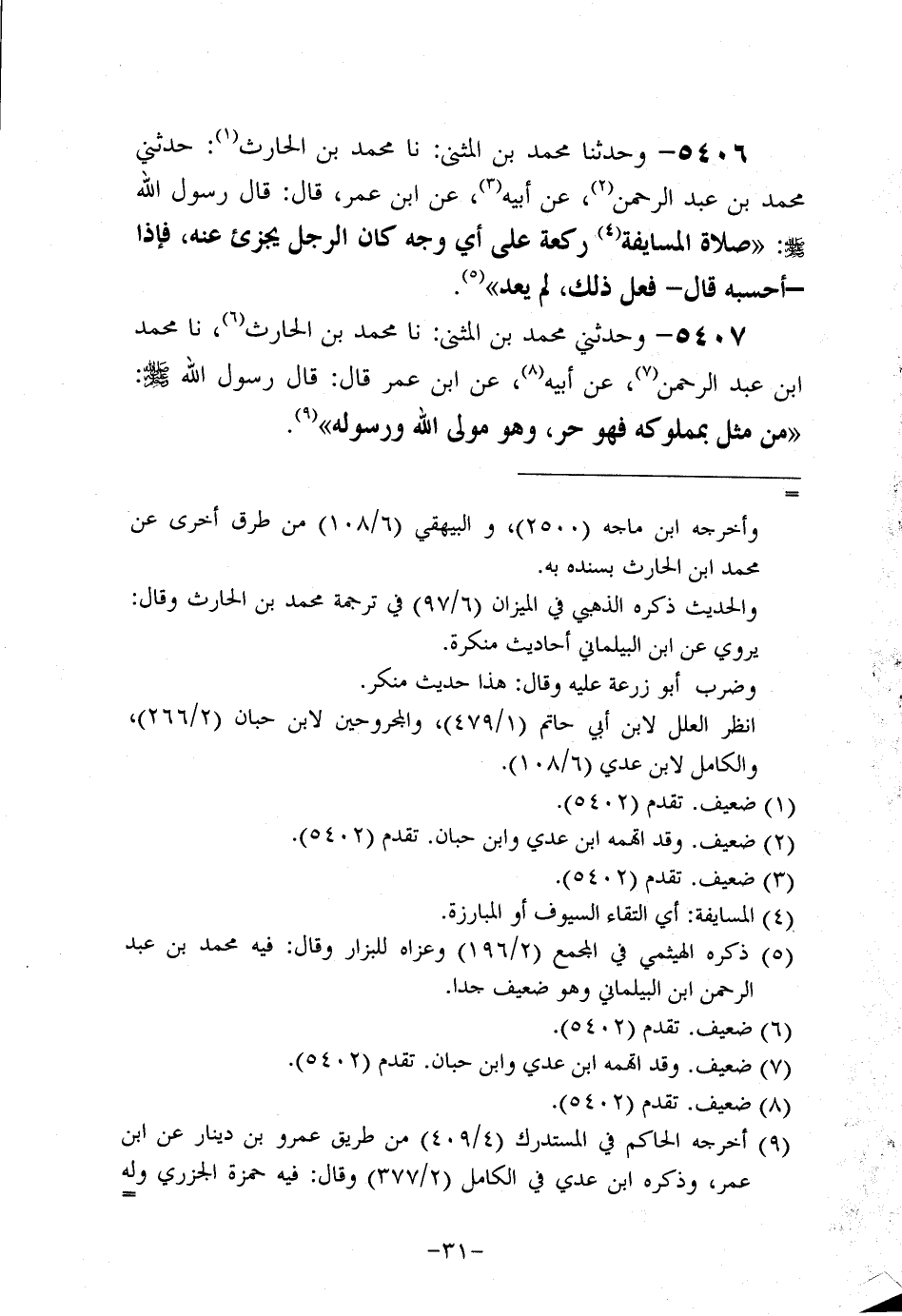 5407- وحدثني مُحَمد بن المثنى، حَدَّثنا مُحَمد بن الحارث، حَدَّثنا مُحَمد بْنُ عَبد الرَّحْمَنِ، عَن أَبِيه، عَن ابْنِ عُمَر قَالَ: قَالَ رَسُول اللهِ صَلَّى اللَّهُ عَلَيه وَسَلَّم: مَنْ مَثَّلَ بِمَمْلُوكِهِ فَهُوَ حُرٌّ، وهُو مَوْلَى اللَّهِ وَرَسُولِهِ.