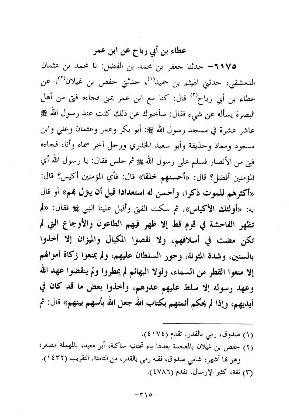 6175- حَدَّثَنَا جَعْفَرُ بْنُ مُحَمَّدِ بْنِ الْفُضَيْلِ (1) ، حَدَّثَنَا مُحَمَّدُ بْنُ عُثْمَانَ الدِّمَشْقِيُّ، حَدَّثَنِي الْهَيْثَمُ بْنُ حُمَيْدٍ، حَدَّثَنِي حَفْصُ بْنُ غَيْلانَ، عَنْ عَطَاءِ بْنِ أَبِي رَبَاحٍ، قَالَ: كُنَّا مَعَ ابْنِ عُمَرَ بِمِنًى، فَجَاءَهُ فَتًى مِنْ أَهْلِ الْبَصْرَةِ، فَسَأَلَهُ عَنْ شَيْءٍ، فَقَالَ: سَأُخْبِرُكَ عَنْ ذَلِكَ، قَالَ: كُنْتُ عِنْدَ رَسُولِ اللهِ صَلَّى اللَّهُ عَلَيْهِ وَسَلَّمَ عَاشِرَ عَشَرَةٍ فِي مَسْجِدِ رَسُولِ اللهِ صَلَّى اللَّهُ عَلَيْهِ وَسَلَّمَ: أَبُو بَكْرٍ، وَعُمَرُ، وَعُثْمَانُ، وَعَلِيٌّ، وَابْنُ مَسْعُودٍ، وَمُعَاذٌ، وَحُذَيْفَةُ، وَأَبُو سَعِيدٍ الْخُدْرِيُّ، وَرَجُلٌ آخَرُ سَمَّاهُ، وَأَنَا، فَجَاءَ فَتًى مِنَ الأَنْصَارِ فَسَلَّمَ عَلَى رَسُولِ اللهِ صَلَّى اللَّهُ عَلَيْهِ وَسَلَّمَ، ثُمَّ جَلَسَ فَقَالَ: يَا رَسُولَ اللهِ، أَيُّ الْمُؤْمِنِينَ أَفْضَلُ؟ قَالَ: أَحْسَنُهُمْ خُلُقًا، قَالَ: فَأَيُّ الْمُؤْمِنِينَ أَكْيَسُ؟ قَالَ: أَكْثَرُهُمْ لِلْمَوْتِ ذِكْرًا، وَأَحْسَنُهُمْ لَهُ اسْتِعْدَادًا قَبْلَ أَنْ يَنْزِلَ بِهِمْ، أَوْ قَالَ: بِهِ، أُولَئِكَ الأَكْيَاسُ، ثُمَّ سَكَتَ الْفَتَى، وَأَقْبَلَ عَلَيْنَا النَّبِيُّ صَلَّى اللَّهُ عَلَيْهِ وَسَلَّمَ، فَقَالَ: لَمْ تَظْهَرِ الْفَاحِشَةُ فِي قَوْمٍ قَطُّ إِلاَّ ظَهَرَ فِيهِمُ الطَّاعُونُ وَالأَوْجَاعُ الَّتِي لَمْ تَكُنْ مَضَتْ فِي أَسْلافِهِمْ، وَلا نَقَصُوا الْمِكْيَالَ وَالْمِيزَانَ إِلاَّ أُخِذُوا بِالسِّنِينَ، وَشِدَّةِ الْمُؤْنَةِ، وَجَوْرِ السُّلْطَانِ عَلَيْهِمْ، وَلَمْ يَمْنَعُوا زَكَاةَ أَمْوَالِهِمْ إِلاَّ مُنِعُوا الْقَطْرَ مِنَ السَّمَاءِ، وَلَوْلا الْبَهَائِمُ لَمْ يُمْطَرُوا، وَلَمْ يَنْقُضُوا عَهْدَ اللهِ وَعَهْدَ رَسُولِهِ إِلاَّ سَلَّطَ اللَّهُ عَلَيْهِمْ عَدُوَّهُمْ، وَأَخَذُوا بَعْضَ مَا كَانَ فِي أَيْدِيهِمْ، وَإذا لَمْ يُحْكَمْ أَئِمَّتُهُمْ بِكِتَابِ اللهِ جَعَلَ اللَّهُ بَأْسَهُمْ بَيْنَهُمْ، قَالَ: ثُمَّ أَمَرَ عَبْدَ الرَّحْمَنِ بْنَ عَوْفٍ أَنْ يَتَجَهَّزَ لِسَرِيَّةٍ أَمَّرَهُ عَلَيْهَا، فَأَصْبَحَ قَدِ اعْتَمَّ بِعِمَامَةِ كَرَابِيسَ سَوْدَاءَ، فَدَعَاهُ النَّبِيُّ صَلَّى اللَّهُ عَلَيْهِ وَسَلَّمَ فَنَقَضَهَا، فَعَمَّمَهُ، وَأَرْسَلَ مِنْ خَلْفِهِ أَرْبَعَ أَصَابِعَ، ثُمَّ قَالَ: هَكَذَا يَابْنَ عَوْفٍ فَاعْتَمَّ، فَإِنَّهُ أَعْرَبُ وَأَحْسَنُ، ثُمَّ أَمَرَ النَّبِيُّ صَلَّى اللَّهُ عَلَيْهِ وَسَلَّمَ بِلالا أَنْ يَدْفَعَ إِلَيْهِ اللِّوَاءَ، فَحَمِدَ اللَّهَ، ثُمَّ قَالَ: اغْزُوا جَمِيعًا فِي سَبِيلِ اللهِ، فَقَاتِلُوا مَنْ كَفَرَ بِاللهِ، لا تَغُلُّوا، وَلا تَغْدِرُوا، وَلا تُمَثِّلُوا وَلا تَقْتُلُوا وَلِيدًا، فَهَذَا عَهْدُ رَسُولِ اللهِ صَلَّى الله عَلَيْهِ وَسَلَّمَ وَسُنَّتُهُ فِيكُمْ.