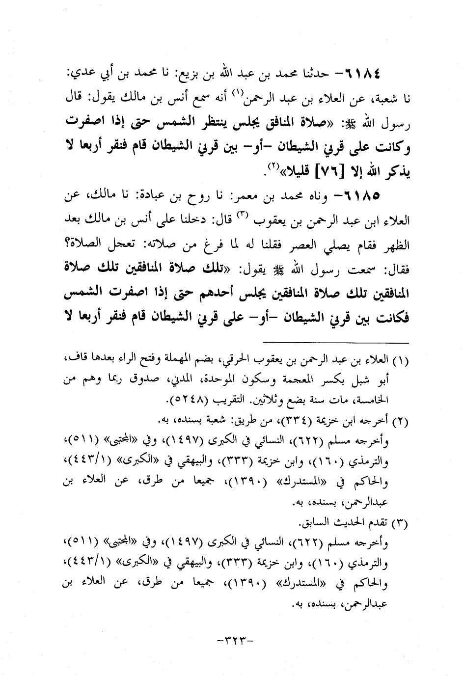 6184- حَدَّثنا مُحَمد بْنُ عَبد اللَّهِ بْنِ بَزِيعٍ، حَدَّثنا مُحَمد بن أبي عَدِيّ، حَدَّثنا شُعْبَةُ، عَن الْعَلاءِ بْنِ عَبد الرَّحْمَنِ أَنَّهُ سَمِعَ أَنَسَ بْنَ مَالِكٍ يَقُولُ: قَالَ رَسُول اللهِ صَلَّى اللَّهُ عَلَيه وَسَلَّم: صَلاةُ الْمُنَافِقِ يَجْلِسُ يَنْتَظِرُ الشَّمْسَ حَتَّى إِذَا اصْفَرَّتْ وَكَانَتْ عَلَى قَرْنَيِ الشَّيْطَانِ، أَوْ بَيْنَ قَرْنَيِ الشَّيْطَانِ قَامَ فَنَقَرَ أَرْبَعًا لا يَذْكُرُ اللَّهَ إلاَّ قليلا.