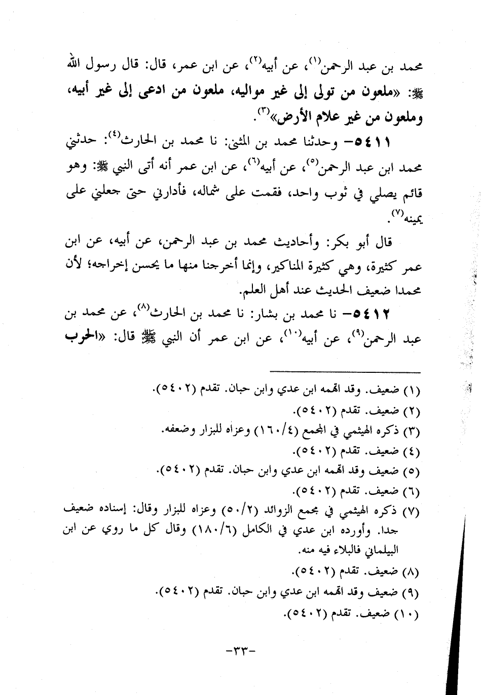 قَالَ أَبُو بَكْرٍ: وَأَحَادِيثُ مُحَمد بْنِ عَبد الرَّحْمَنِ، عَن أَبِيه، عَن ابْنِ عُمَر كَثِيرَةٌ وَهِيَ كَثِيرَةُ الْمَنَاكِيرِ، وَإنَّما أَخْرَجْنَا مِنْهَا مَا يَحْسُنُ إخراجه لأن مُحَمد ضعيف الحديث عند أهل العلم.