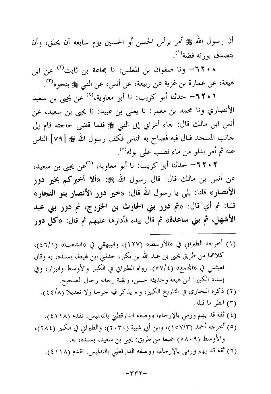 6202- حَدَّثنا أَبُو كُرَيب، حَدَّثنا أَبُو مُعَاوِيَةَ، عَن يَحْيَى بْنِ سَعِيد، عَن أَنَسِ بْنِ مَالِكٍ قَالَ: قَالَ رَسُول اللهِ صَلَّى اللَّهُ عَلَيه وَسَلَّم: أَلا أُخْبِرُكُمْ بِخَيْرِ دُورِ الأَنْصَارِ قُلْنَا: بَلَى يَا رَسولَ اللهِ قَالَ: خَيْرُ دُورِ الأَنْصَارِ بَنُو النَّجَّارِ قُلْنَا: ثُمَّ أَيُّ قَالَ: ثُمَّ دُورُ بَنِي الْحَارِثِ بن الخزرج، ثُمَّ دور بني الأشهل، ثُمَّ بني ساعدة، ثُمَّ قال بيد فَأَدَارَهَا عَلَيْهِمْ، ثُمَّ قَالَ: كُلُّ دُورِ الأَنْصَارِ خَيْرٌ.