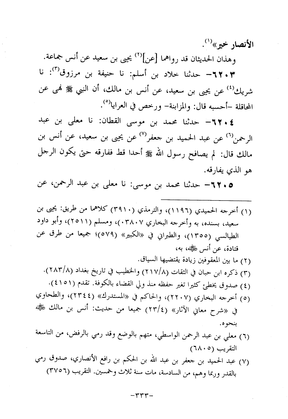 6204- حَدَّثنا مُحَمد بن موسى القطان، حَدَّثنا مُعَلَّى بْنُ عَبد الرَّحْمَنِ، عَن عَبد الْحَمِيدِ بْنِ جَعْفَرٍ، عَن يَحْيَى بْنِ سَعِيد، عَن أَنَسِ بْنِ مَالِكٍ قَالَ: لَمْ يُصَافِحْ رَسُولُ اللَّهِ صَلَّى اللَّهُ عَلَيه وَسَلَّم أَحَدًا قَطُّ فَفَارَقَهُ حَتَّى يَكُونَ الرَّجُلُ هُوَ الَّذِي يُفَارِقُهُ.