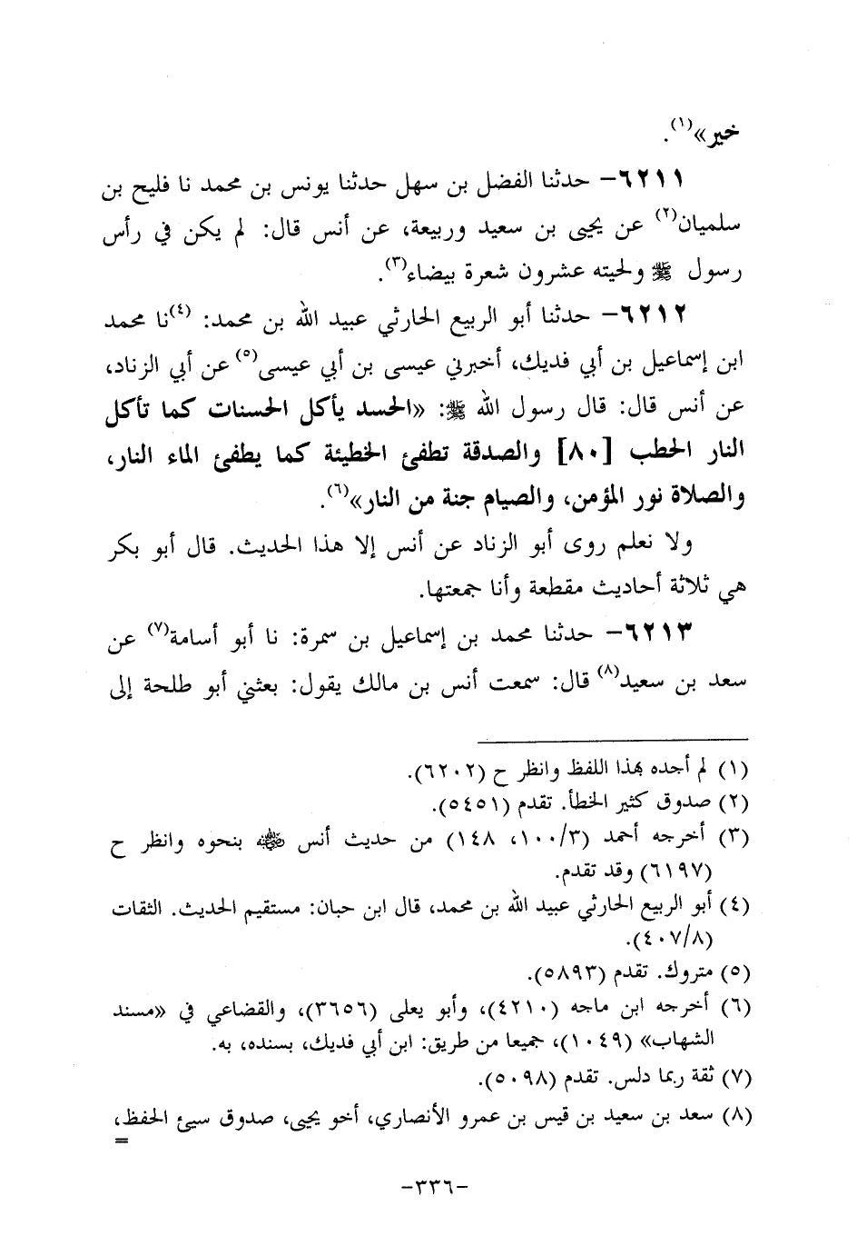 6212- حَدَّثنا أَبُو الرَّبِيعِ الْحَارِثِيُّ عُبَيد اللَّهِ بْنُ مُحَمد، حَدَّثنا مُحَمد بْنُ إِسْمَاعِيلَ بْنِ أَبِي فُدَيْكٍ أَخْبَرَنِي عِيسَى بْنُ أَبِي عِيسَى، عَن أَبِي الزِّنَادِ، عَن أَنَسٍ قَالَ: قَالَ رَسُول اللهِ صَلَّى اللَّهُ عَلَيه وَسَلَّم: الْحَسَدُ يَأْكُلُ الْحَسَنَاتِ كَمَا تأكل النار الحطب والصدقة تطفيء الخطيئة كما يطفىء الْمَاءُ النَّارَ وَالصَّلاةُ نُورُ الْمُؤْمِنِ وَالصِّيَامُ جُنَّةٌ مِنَ النَّارِ.