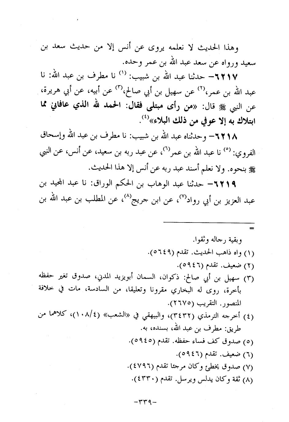 6217- حَدَّثنا عَبد الله بن شَبِيب، حَدَّثنا مطرف بن عَبد الله، حَدَّثنا عَبد اللَّهِ بْنُ عُمَر، عَن سُهَيْلِ بْنِ أَبِي صَالِحٍ، عَن أَبِيه، عَن أَبِي هُرَيرة، عَن النَّبِيّ صَلَّى اللَّهُ عَلَيه وَسَلَّم قَالَ: مَنْ رَأَى مُبْتَلًى فَقَالَ: الْحَمْدُ للَّهِ الَّذِي عَافَانِي مِمَّا ابْتَلاكَ بِهِ إلاَّ عُوفِيَ مِنْ ذَلِكَ الْبَلاءِ.