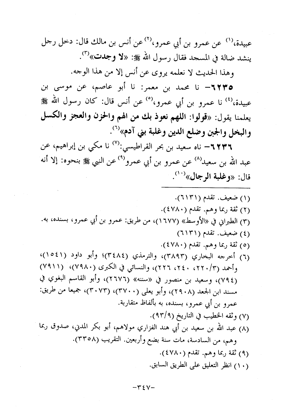 6236 - حَدَّثَناه سَعِيد بن بحر القراطيسي، حَدَّثنا مَكِّيُّ بْنُ إِبْرَاهِيمَ، عَن عَبد اللَّهِ بْنِ سَعِيد، عَن عَمْرو بْنِ أَبِي عَمْرو، عَن النَّبِيّ صَلَّى اللَّهُ عَلَيه وَسَلَّم، بِنَحْوِهِ: إلاَّ أَنَّهُ قَالَ: وَغَلَبَةِ الرِّجَالِ.