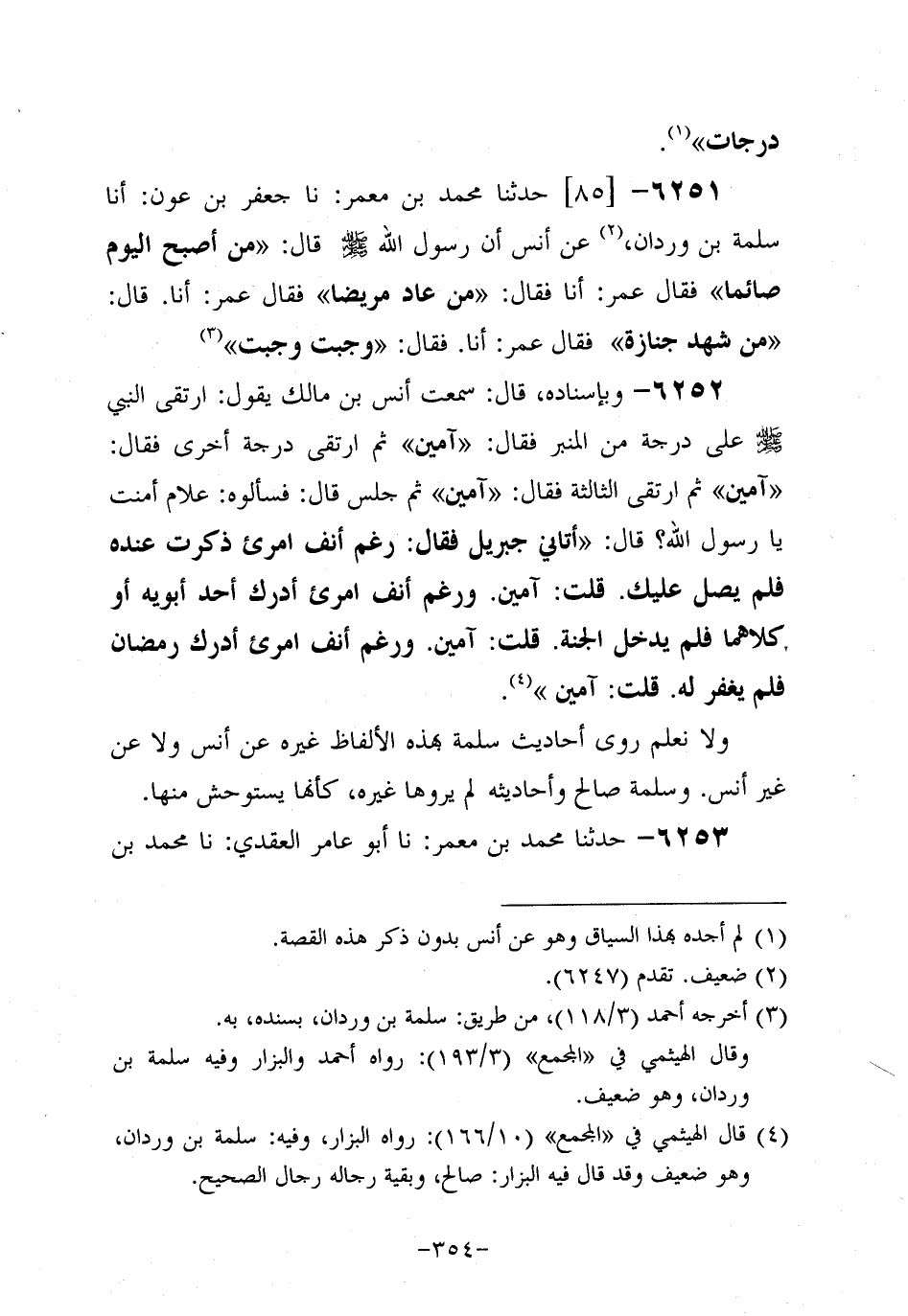 6252 - وَبِإِسْنَادِهِ، قَالَ: سَمِعْتُ أَنَسَ بْنَ مَالِكٍ يَقُولُ: ارْتَقَى النَّبِيّ صَلَّى اللَّهُ عَلَيه وَسَلَّم عَلَى دَرَجَةٍ مِنَ الْمِنْبَرِ فَقَالَ: آمِينَ، ثُمَّ ارْتَقَى دَرَجَةً أُخْرَى فَقَالَ آمِينَ، ثُمَّ ارْتَقَى الثَّالِثة فَقَالَ: آمِينَ، ثُمَّ جَلَسَ قَالَ: فَسَأَلُوهُ: عَلامَ أَمَّنْتَ يَا رَسولَ اللهِ؟ قَالَ: أَتَانِي جِبْرِيلُ فقال: رغم أنف امرىء ذُكِرْتَ عِنْدَهُ فَلَمْ يُصَلِّ عَلَيْكَ قُلْتُ:آمِينَ وَرَغِمَ أَنْفُ امْرِئٍ أَدْرَكَ أَحَدَ أَبَوَيْهِ، أَوْ كِلاهُمَا فَلَمْ يَدْخُلِ الْجَنَّةَ. قُلْتُ: آمِينَ. وَرَغِمَ أنف امرىء أَدْرَكَ رَمَضَانَ فَلَمْ يُغْفَرْ لَهُ. قُلْتُ: آمِينَ.