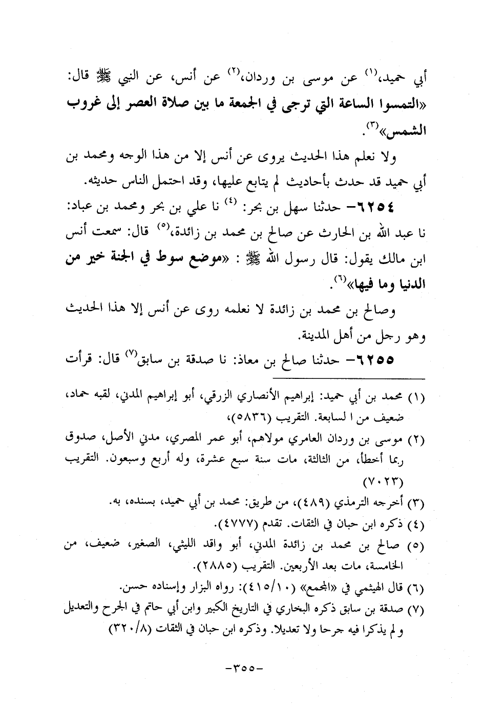6254- حَدَّثنا سَهْل بن بحر، حَدَّثنا علي بن بحر، ومُحَمَّد بن عباد، حَدَّثنا عَبد اللَّهِ بْنُ الْحَارِثِ، عَن صَالِحِ بْنِ مُحَمد بْنِ زَائِدَةَ، قَالَ: سَمِعْتُ أَنَسَ بْنَ مَالِكٍ يَقُولُ: قَالَ رَسُول اللهِ صَلَّى اللَّهُ عَلَيه وَسَلَّم: مَوْضِعُ سَوْطٍ فِي الْجَنَّةِ خَيْرٌ مِنَ الدُّنْيَا وَمَا فِيهَا.