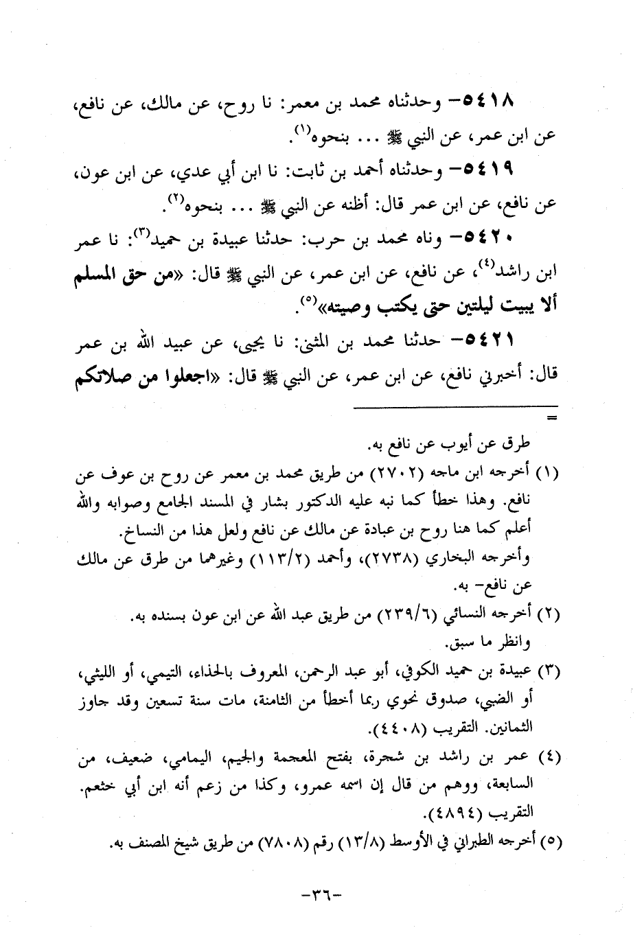5420- وحَدَّثناه مُحَمد بْنُ حَرْبٍ: حَدَّثنا عُبَيْدَةُ بْنُ حُمَيد، حَدَّثنا عُمَر بْنُ رَاشِدٍ، عَن نافعٍ، عَن ابْنِ عُمَر، عَن النَّبِيّ صَلَّى اللَّهُ عَلَيه وَسَلَّم قَالَ: مِنْ حَقِّ الْمُسْلِمِ أَلا يَبِيتَ لَيْلَتَيْنِ حَتَّى يَكْتُبَ وَصِيَّتَهُ.